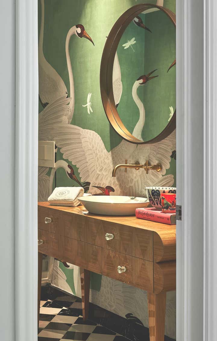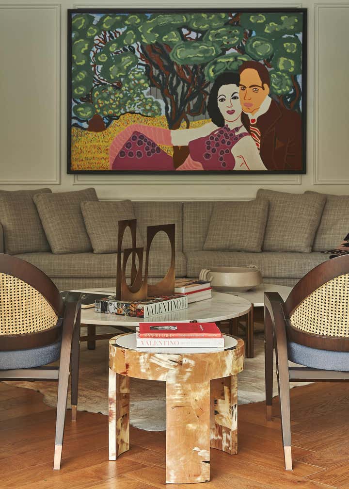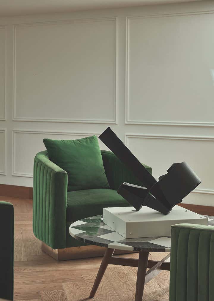 This house has a seaside, modern, original design from early the 2000’s and as a backbone, it worked perfectly. Given that the property’s ceiling was rather low, I felt that classic elements like moldings in walls and herringbone wooden floors would be a great way to separate the entrance from the rest of the house. For final touches, I incorporated a marble chess-like table with a bronze base and Kelly Wearstler’s Elliott chairs. An art piece by artist Alvaro Barrios closed the deal.