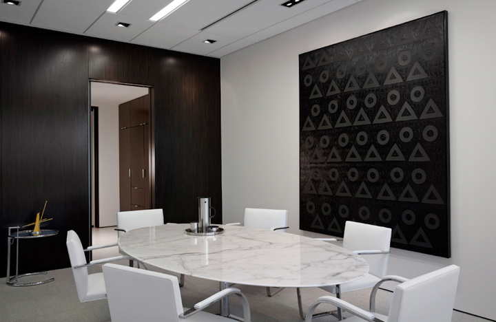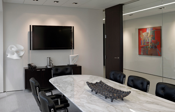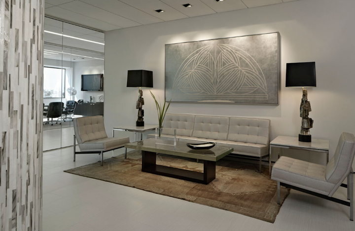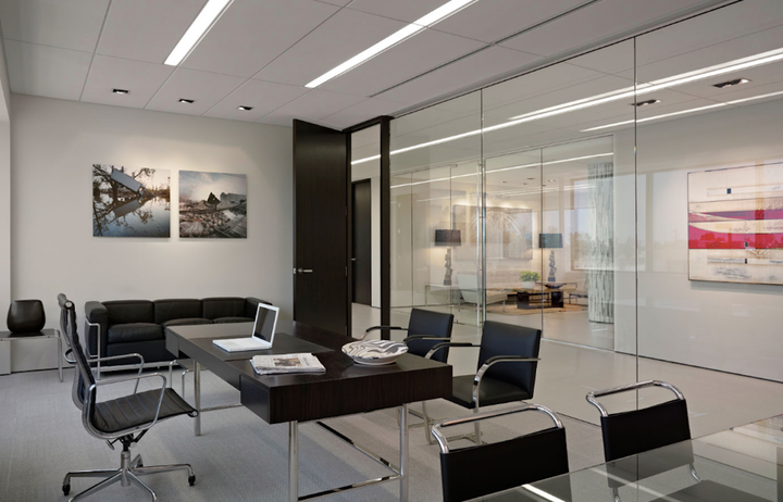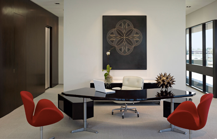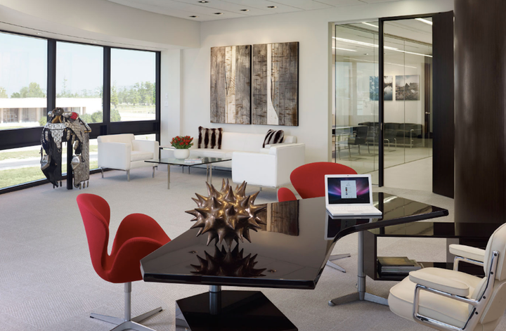 Shortly after Hurricane Katrina, a real estate developer and art dealer/collector purchased a badly damaged office building east of New Orleans in one of the hardest hit areas. While renovating the property, he decided to “carve out” 5,500 square feet on an upper floor for his company headquarters. The design of the space was organized around a wide central spine so that circulation could double as a place to display and view art. Glass walls were liberally used to pull natural light from the exterior wall into perimeter as well as interior spaces. The rooms were unified by a Mondrian-like color palette of white/off-white, dark brown/black and red.