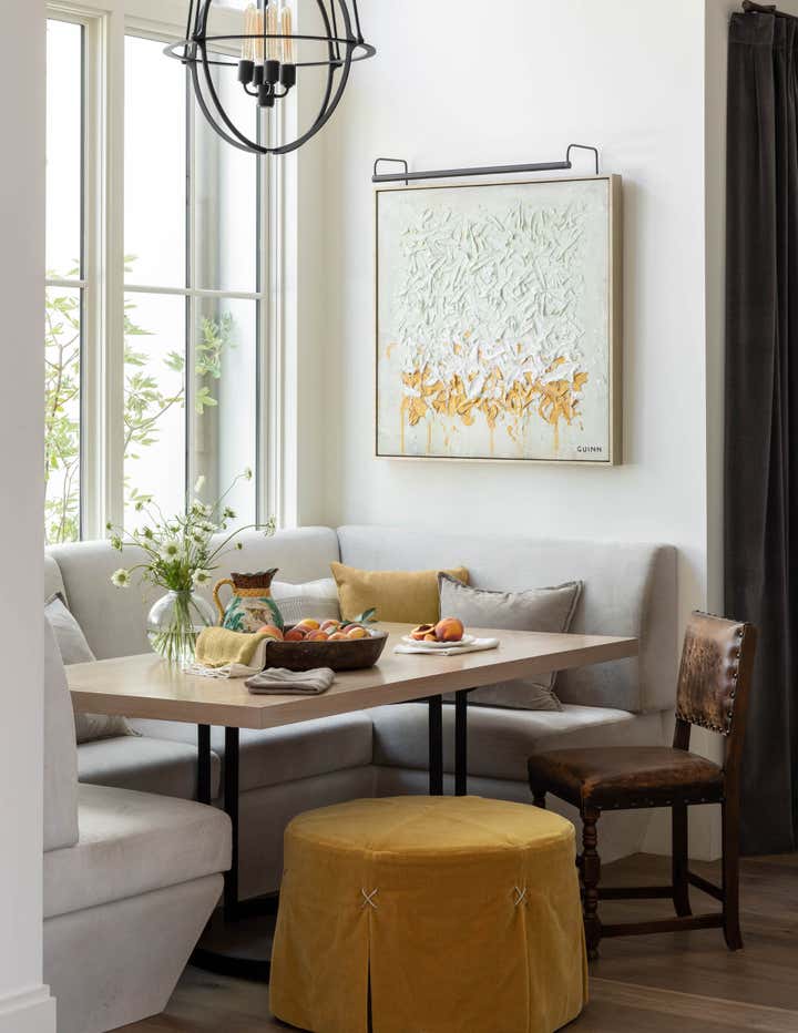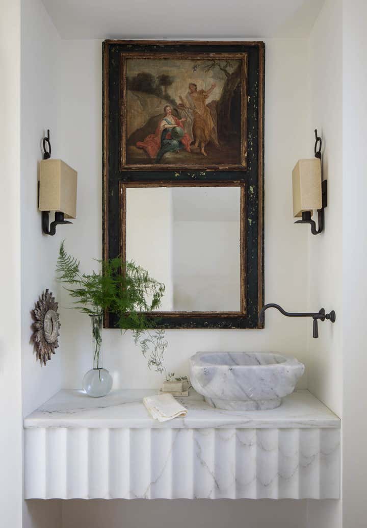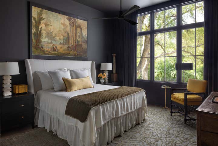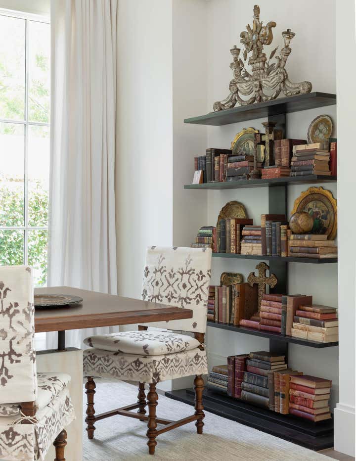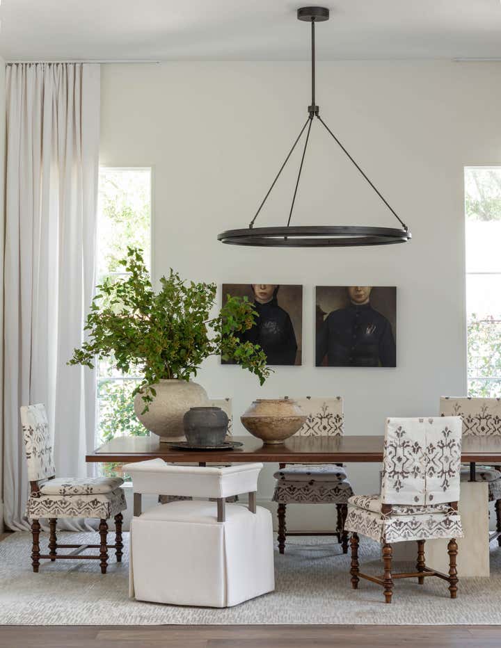 At the same time, modern custom designs are woven in, like leather-clad ottomans and a sleek steel bookcase in the dining room. Restraint is key, with light fabrics and spaced-out decor to prevent the space from feeling heavy. Dark and light contrasts, especially in the lighting fixtures, add drama and visual interest throughout. In the guesthouse, or casita, the design takes on a simpler, more rustic aesthetic, with finer contrasts and a softer color palette. Ultimately, the home feels like a journey, continually revealing new surprises and transporting visitors to a place of beauty and discovery.