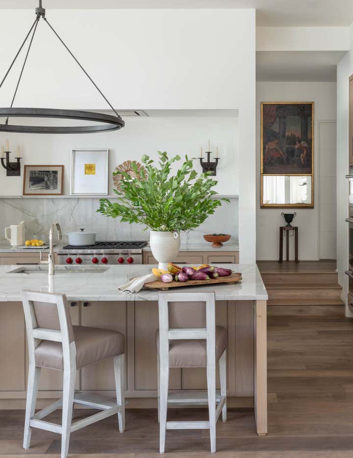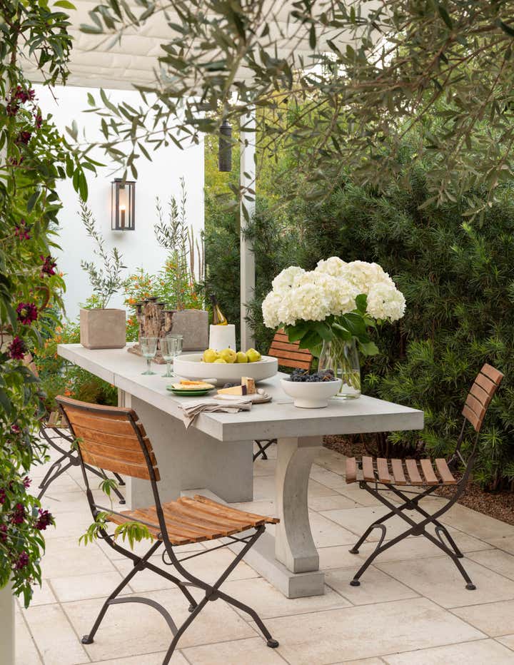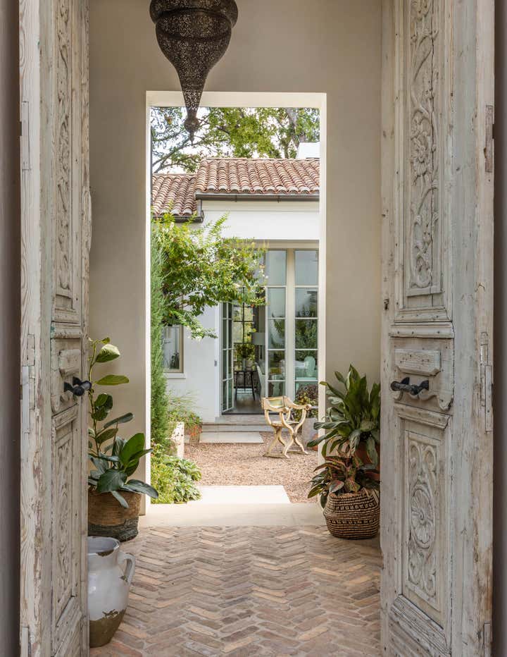 From the moment visitors step through the carved wooden door of this residence, they are transported to another world that feels far removed from the city. Designed in collaboration with architect Charles Travis, the house is an artful blend of Spanish and Mediterranean influences, combined with modern, clean-lined elements. The entrance opens into a paseo, where a Moroccan lantern casts soft light, and the floor s herringbone brickwork sets a rustic tone. Beyond the second doorway, the courtyard unfolds, with its warm red roof tiles, pea gravel, and lush foliage, accompanied by the soothing sound of water.