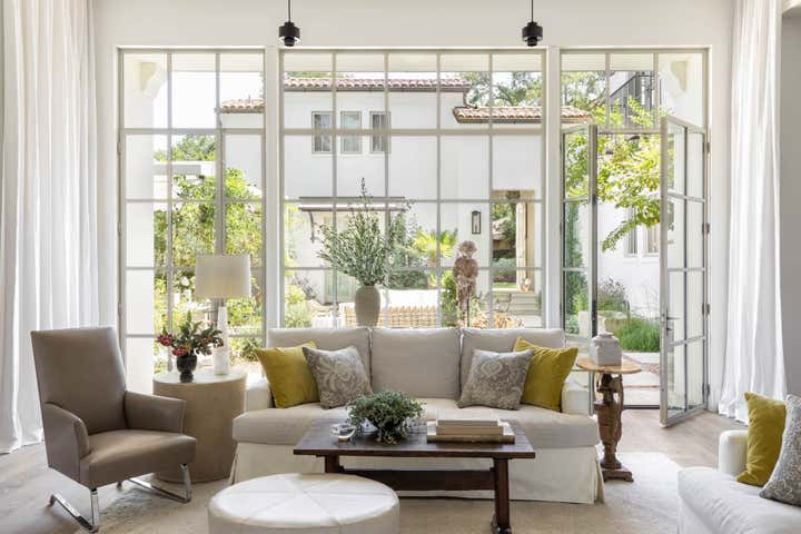 The central courtyard acts as the heart of the home, surrounded by glass-and-steel windows that soften their contemporary lines with greenish putty-colored frames. This mix of old-world charm and modern minimalism creates an interesting dynamic. The home s interiors continue this balance, featuring a carefully curated collection of Spanish, Mexican, and global antiques, including Belgian doors and an Indonesian ceiling panel. These pieces, though diverse, share a textured, tactile quality that unifies the space.