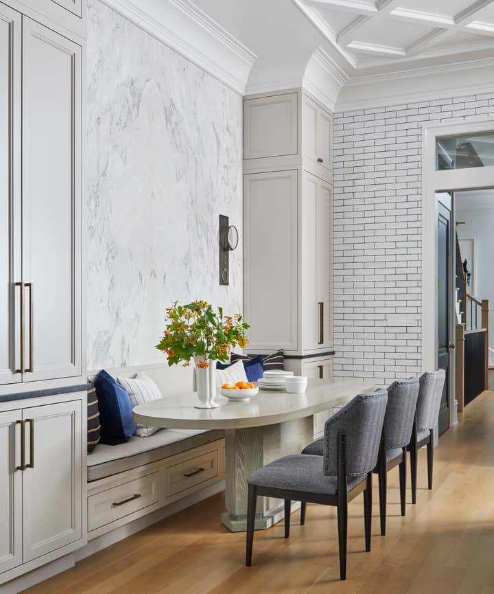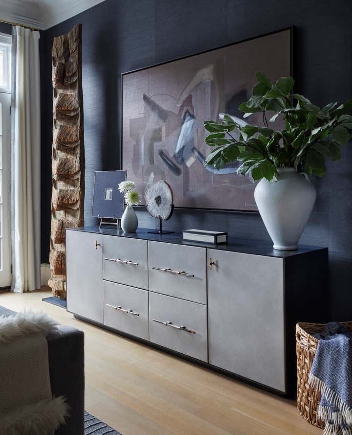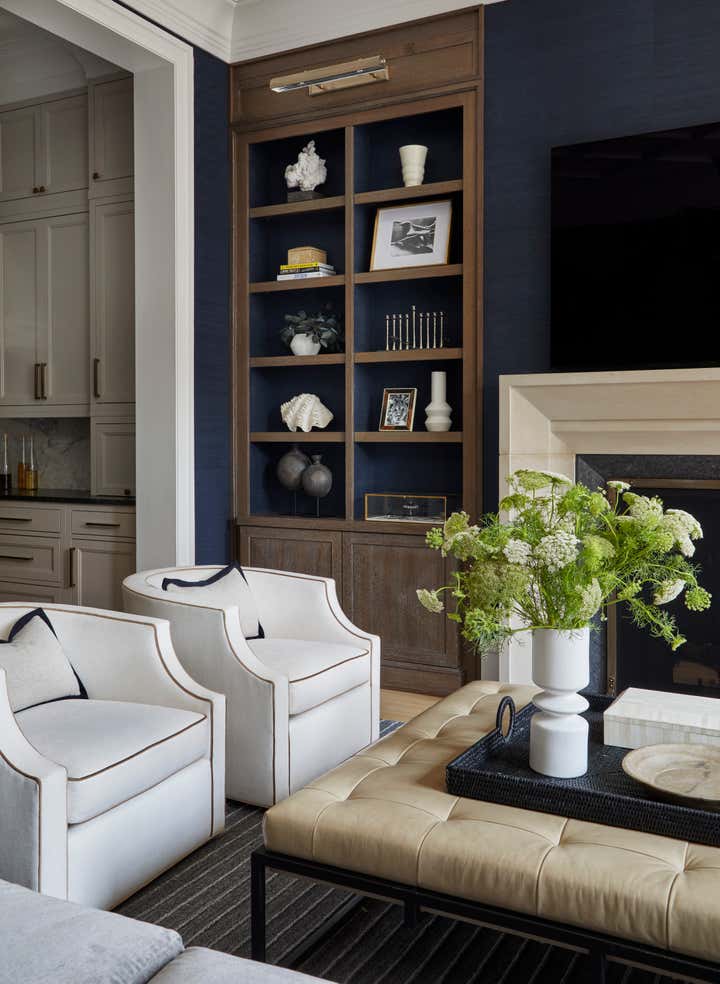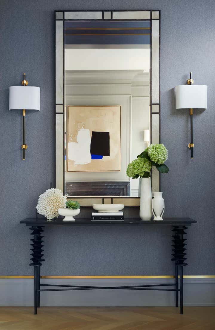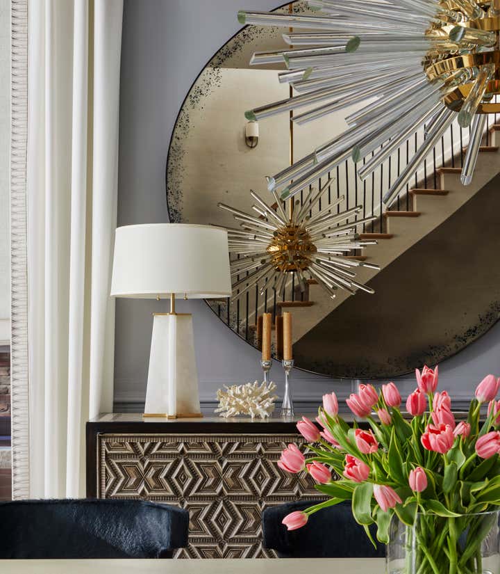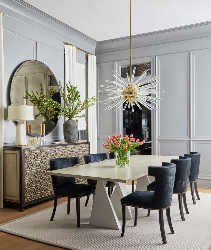 When they returned home to Chicago after a decade in New York, our clients agreed that they needed a larger home for their young, growing family. When it came to their design styles, however, they were on two ends of the spectrum. While he has a sense of style rooted in timelessness, clean lines, and classical architecture, she has a penchant for color, collections, and anything that feels a little organically collected and unique. Their common ground? A love for Jean Louis Deniot. With that as a starting point, we embraced his preference for restraint and her love for color to find the perfect design medley. A fixture in the dining room inspired by a vintage Miracle Chandelier suits him. A 160-year-old Balinese sculpture in the Family Room suits her. Incredible antique doors pulled from a Parisian residence with new Nanz hardware repurposed as their Entry coat closet doors appeal to both. The unique blend of their styles perfectly defines them and their own personal creation of home.