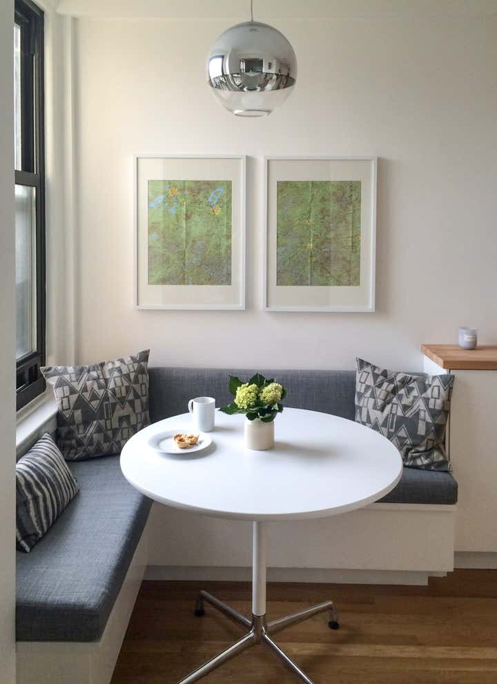 Offering a perch to people watch over Central Park and the busy west side streets below, a breakfast nook was an absolute must. A custom-designed banquette offers functional seating with simple millwork that mirrors the adjacent kitchen’s front slab cabinets. Upholstered in Arabel Fabrics linen, the cushion top conceals piano hinges, opening the banquette up for storage within. The corner seating is perfectly scaled to accommodate Tarsi’s beloved 36” round Herman Miller table. Above, a chrome lighting pendant from Tom Dixon ties in with the table’s metallic foot accents. Accessorized with West Elm pillows and framed Adirondack Mountains maps to honor Tarsi’s husband’s Upstate roots, the cozy banquette offers a transitional space to bask in the natural light shining within.
