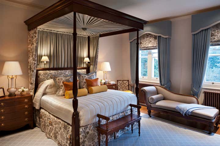 This stunning Victorian house with Edwardian additions was originally built in 1880, it is a perfect example of Victorian Gothic ‘Lite’. My brief was to complete the restoration upgrade and period repairs, as well as to redo the joinery and decorate the non-historic areas of the house from scratch. Whilst peeling off some horrible blue paisley-pattered wallpaper in the dining room, we happened upon an incredible classical frieze. We cleaned the frieze and were able to safeguard about sixty to seventy percent of it. On the wall underneath it we hung a warm sun-on-wheat-field coloured silk and trimmed the frieze top and bottom with gilt edging.The client wanted a traditional four-poster bed to be the main feature of the master bedroom, but one without frills. We had this frame made in early nineteenth-century style but with twenty-first century proportions, and dressed it in a gorgeous, Bennison hand-printed linen.