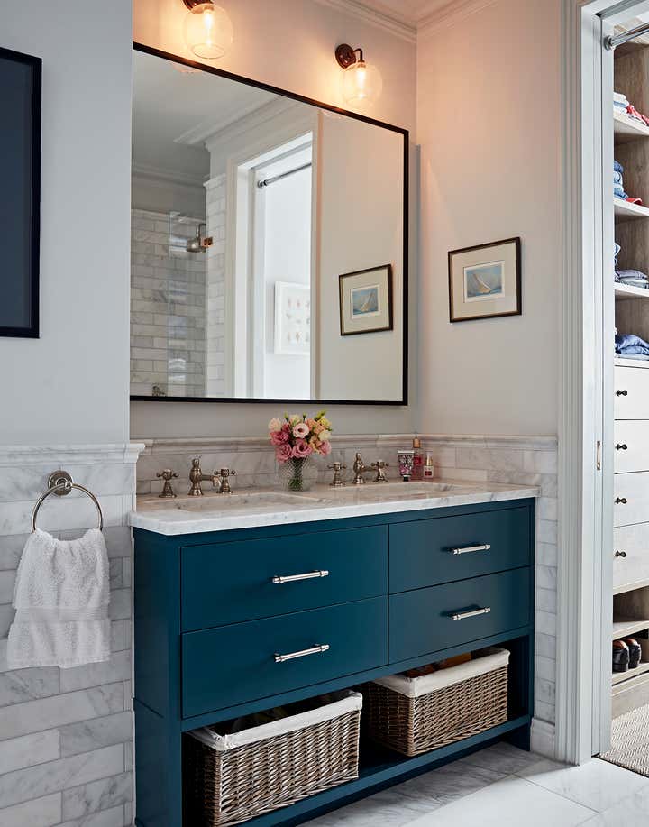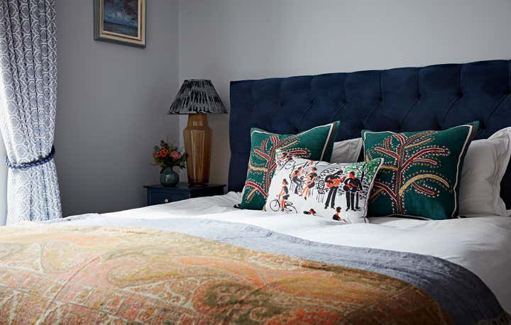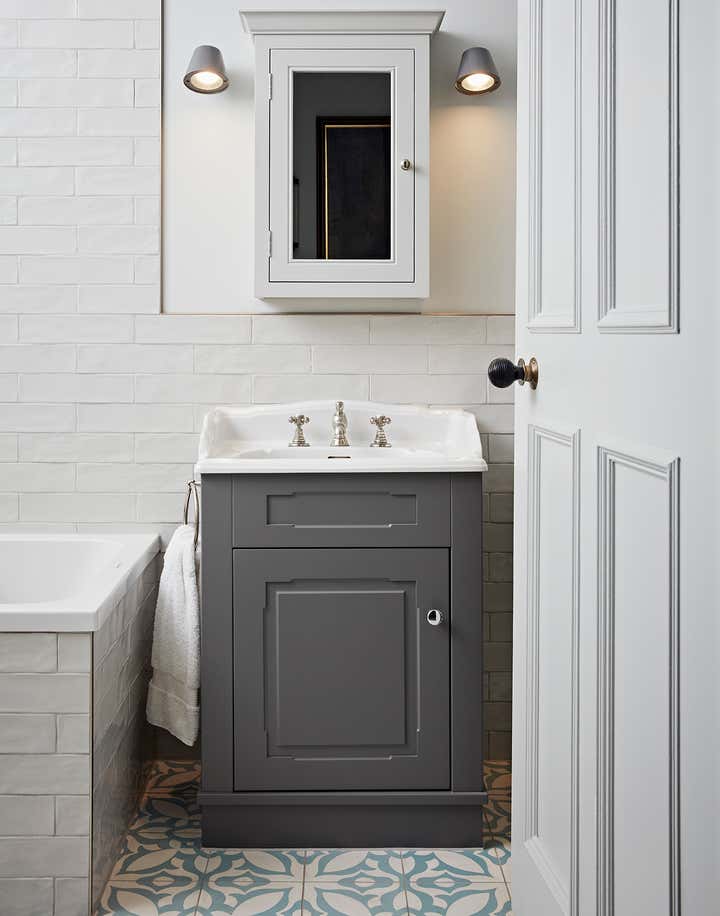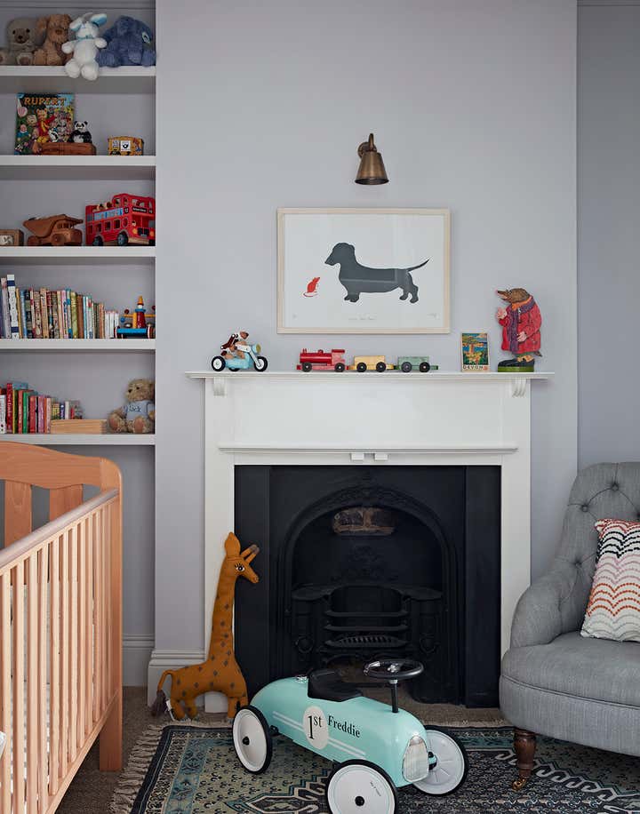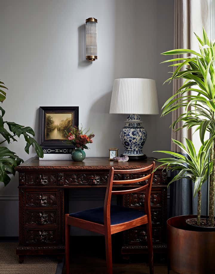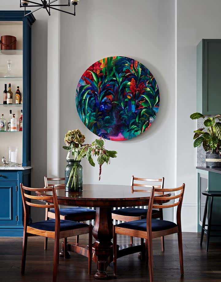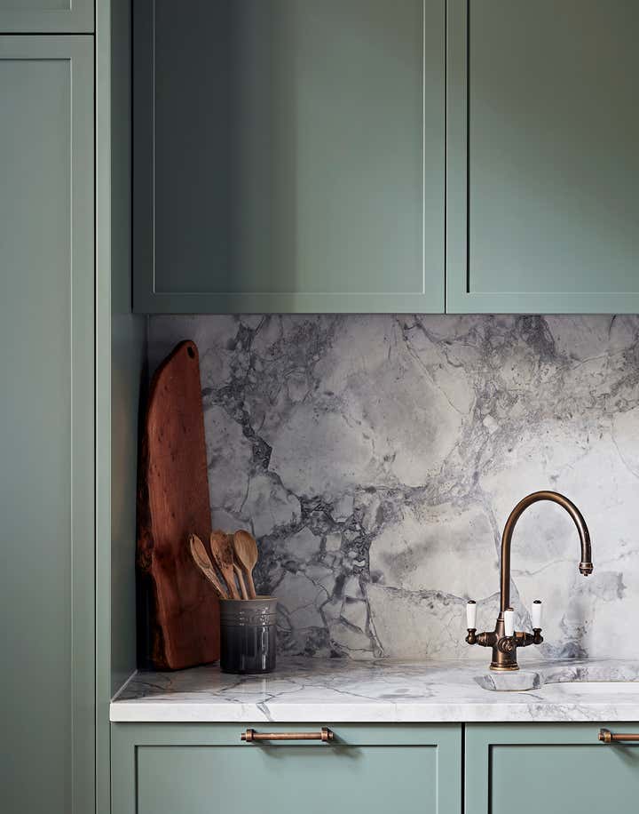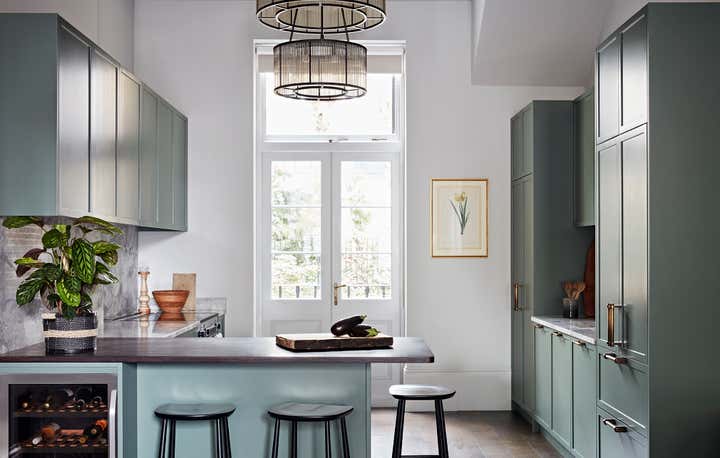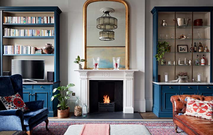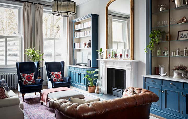 With ceilings nearly 4m high, this open-plan reception, dining and kitchen is the dream! We removed the dividing wall creating one large space and built an external cast Iron, walkway to directly access the garden from the kitchen. This transformed the Victorian layout into one suited to modern family life. Clever use of the original coal vault allowed for a self-contained apartment for a nanny or long-stay guest complete with shower room, and kitchenette. The dark wood floors were paired with blue and green hues with touches of marble and bronze to create an elegant family home.