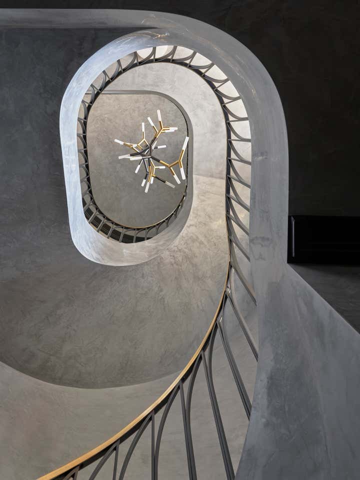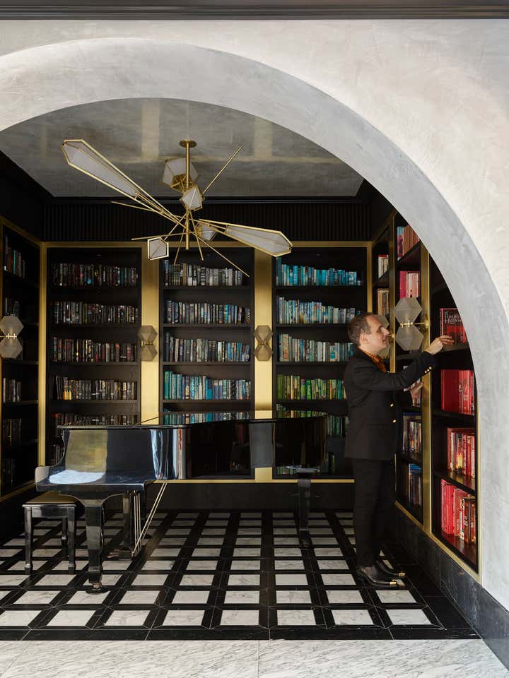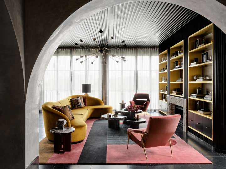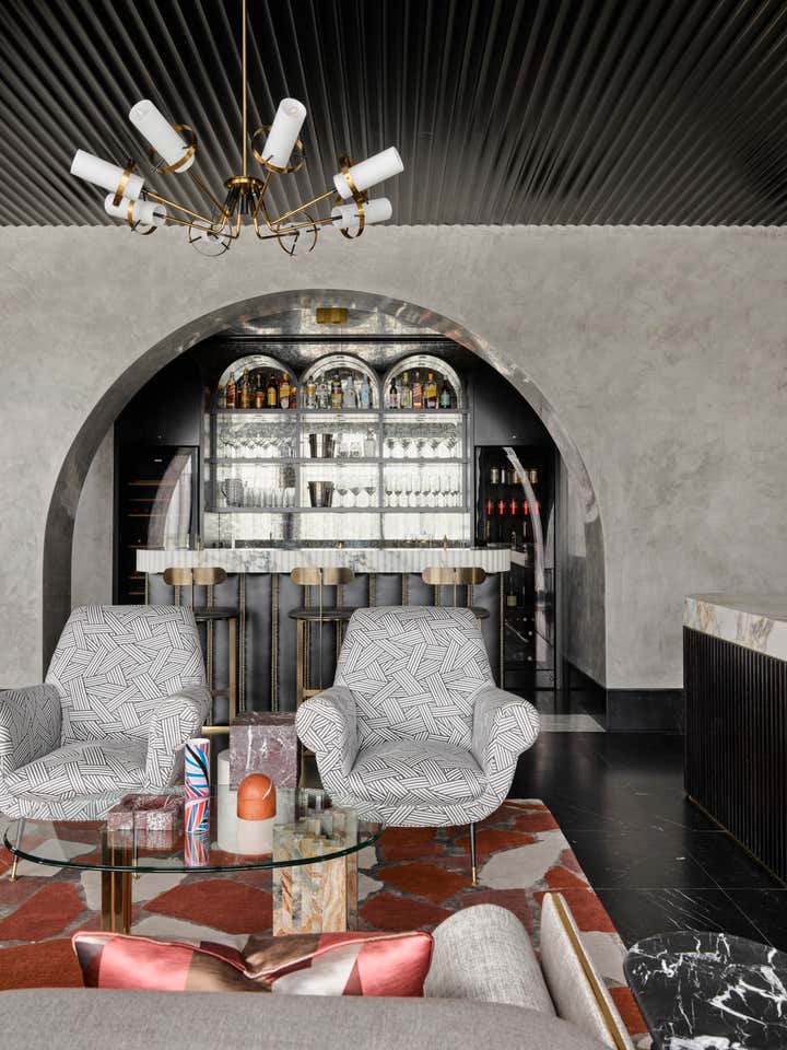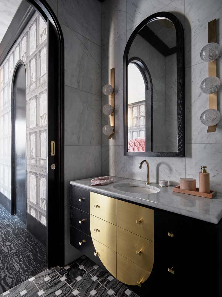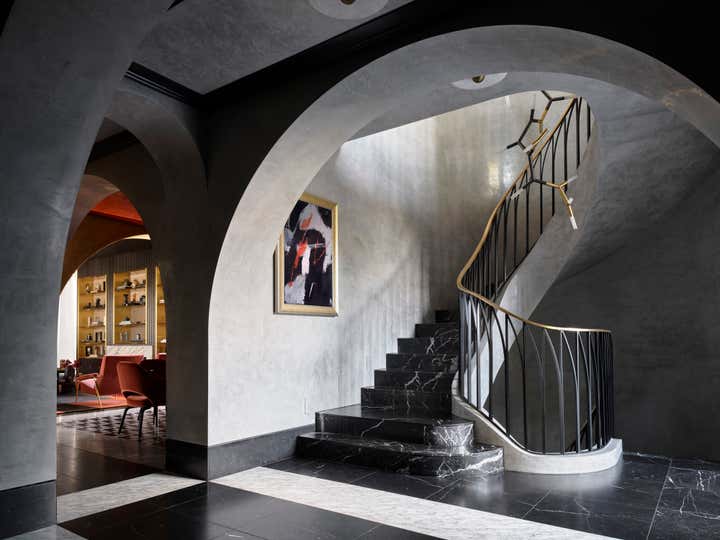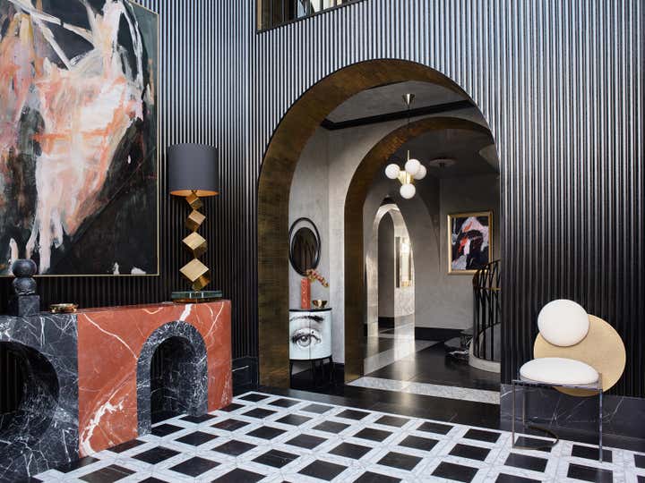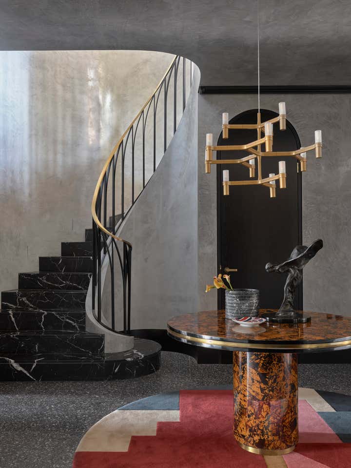 Inspired by arches along the house’s exterior, Greg Natale Design introduced this feature throughout the interior. Beyond a glass-walled entrance with black and white marble floors and black fluted timber walls, a series of arches unfolds in velvety grey stucco above smooth slabs of Nero Marquina marble flooring.