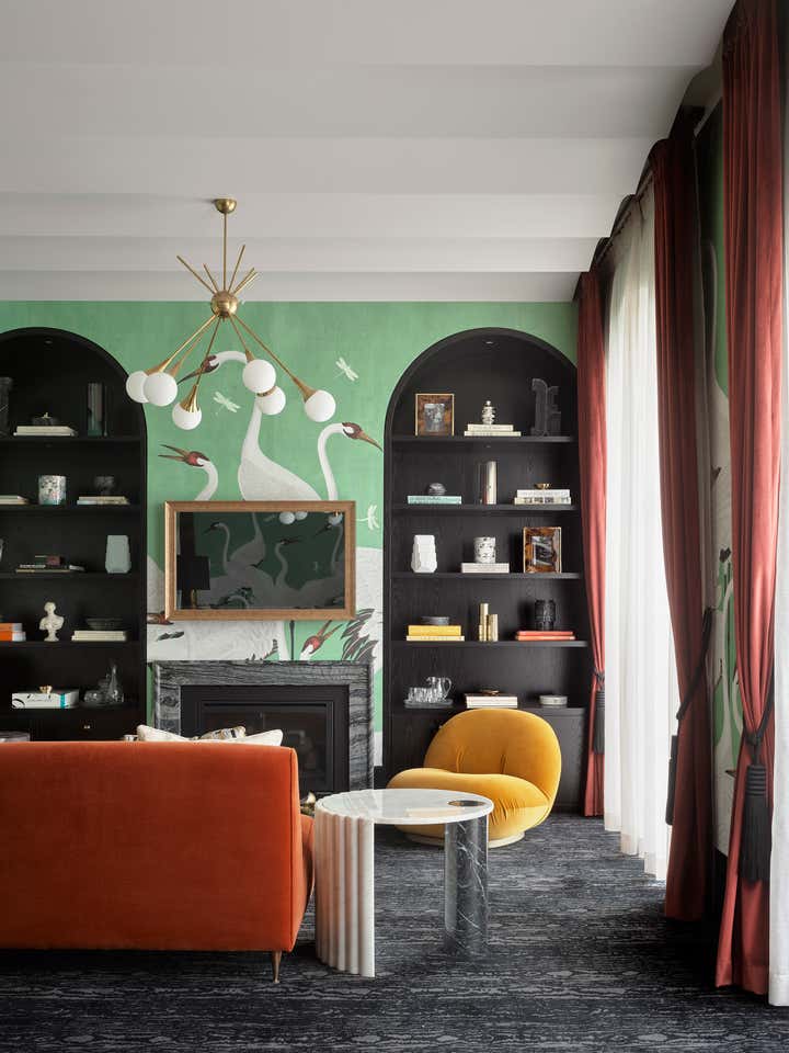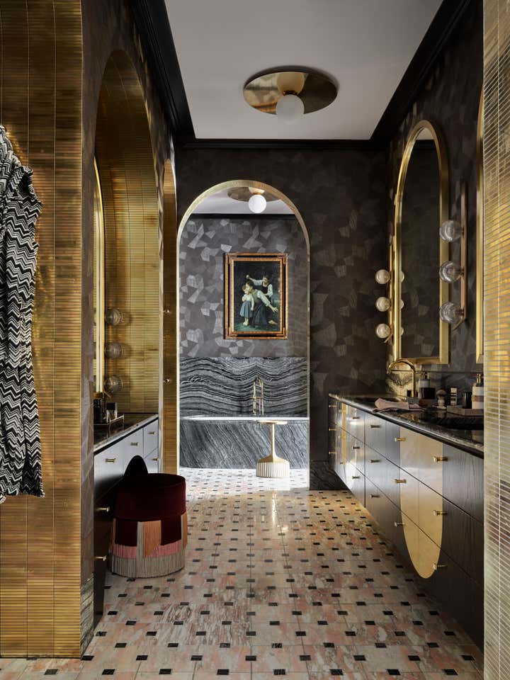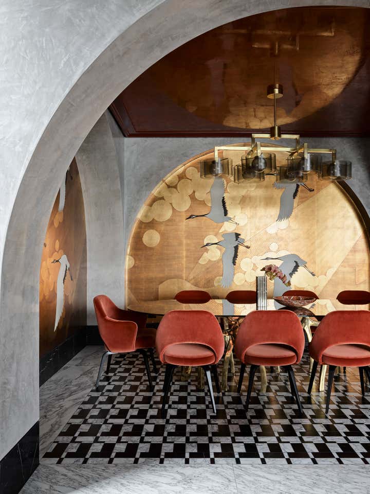 Enticing glimpses of rooms appear between the arches, such as the dining room, with its gold-toned de Gournay wallpaper. Here, chairs in brick-red velvet bring a burst of colour, which continues in the nearby kitchen stools and living room chairs, teamed with a mustard velvet sofa. These rich hues are joined by brass accents that appear throughout the house.