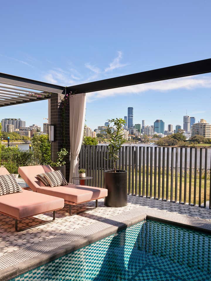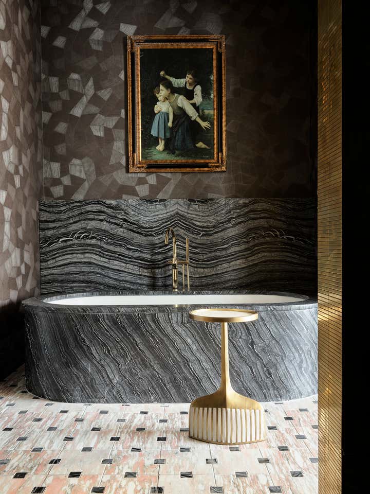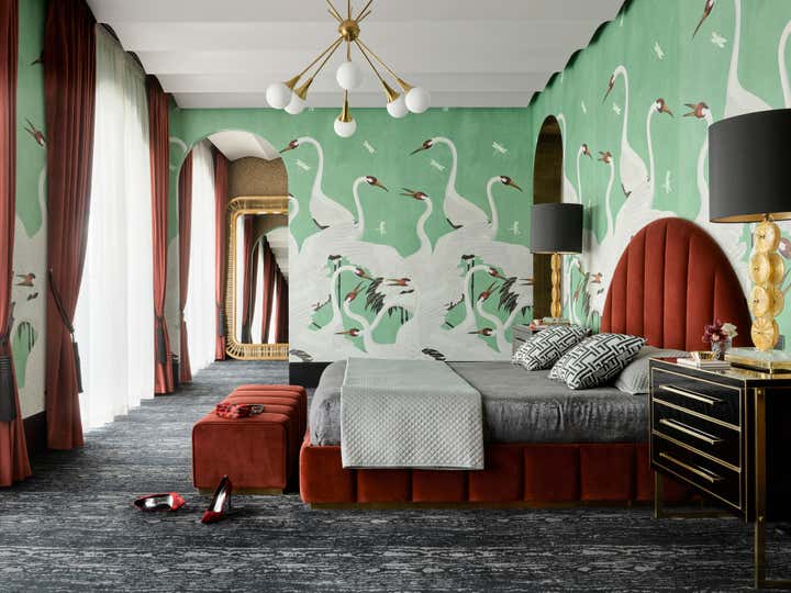 Wallpaper brings glorious colour and pattern, from Gucci herons in the master bedroom to Fornasetti foliage in the pool room. Featuring lavish finishes like fluted joinery and marble baths, this spectacular house draws on classical elements to offer contemporary luxury.