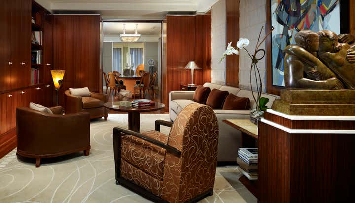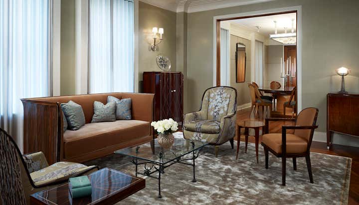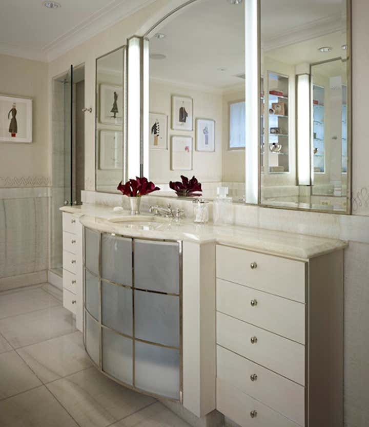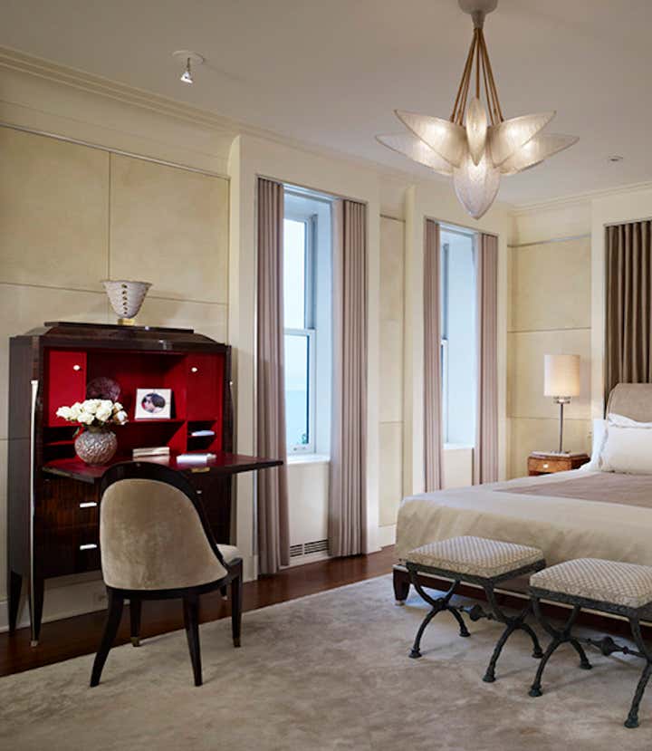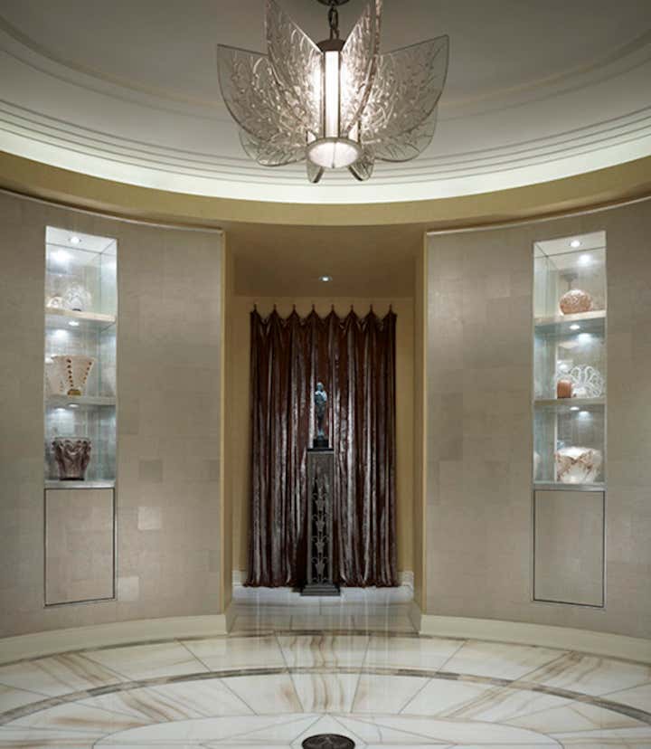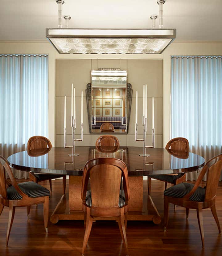 This Lake Shore Drive apartment houses the treasures of a consummate collector. The Emile-Jacques Ruhlmann dining table once belonged to Andy Warhol, while the foyer alcoves contain museum-worthy René Lalique crystal. Through interior architecture, we created an envelope that evokes the era with fabric-wrapped panels, shagreen, and rosewood. To create a luminous jewel box, we exaggerated the window trim and added silver leafing. In the bathroom, we stenciled a Deco design in silver above the onyx wainscot. We commissioned Lalique fabric to upholster the living room’s Ruhlmann chairs, while Lalique crystal light fixtures appear throughout the apartment. Driven by the collection, the palette reflects Art Deco’s fondness for rich finishes.