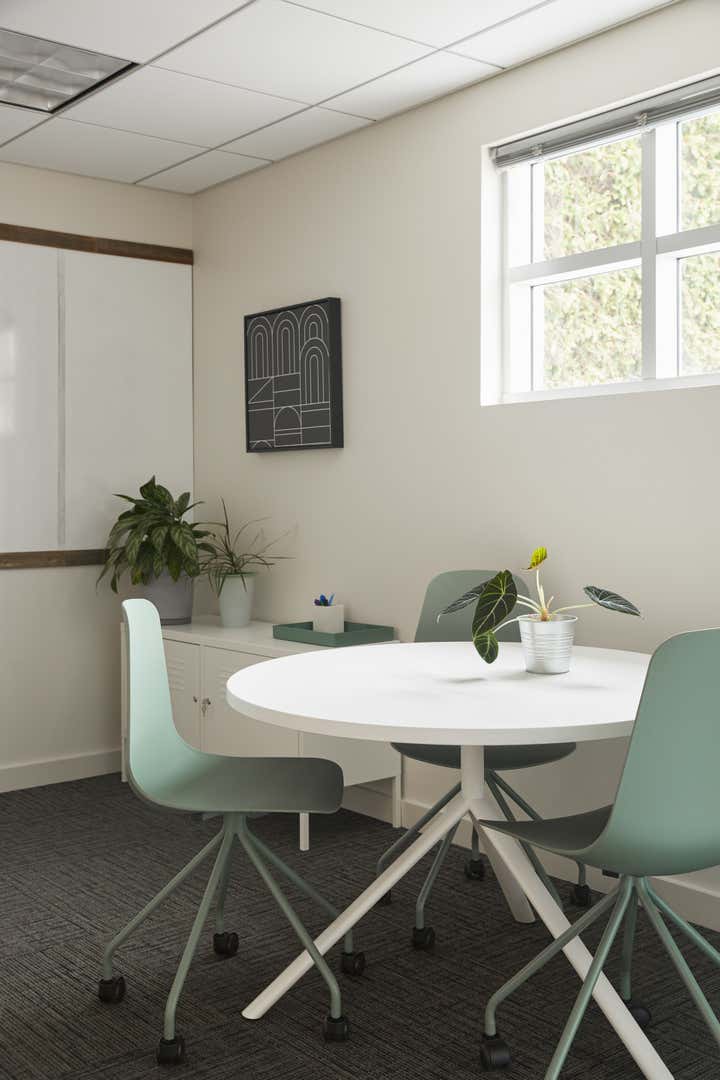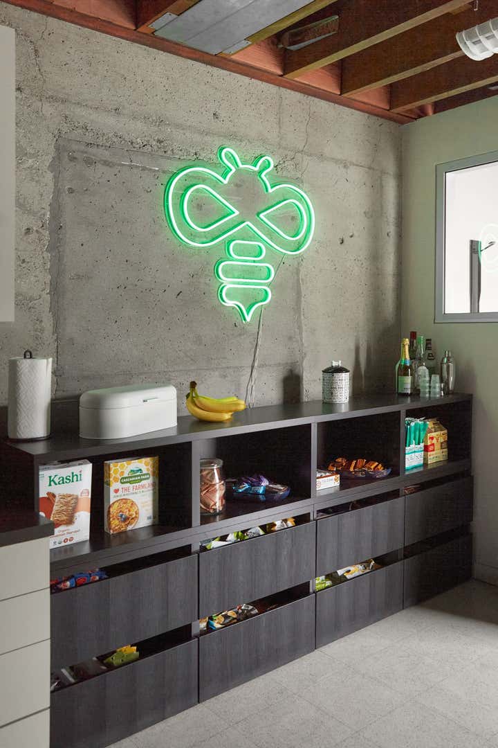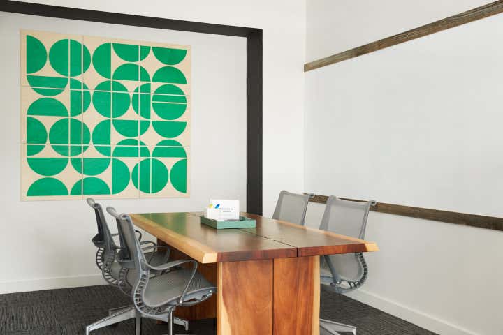 We implemented flexible private offices that are available to all members of this highly collaborative team, for whom daily all-team lunches are a means to unwind and connect with one another. Carefully considered applications of Equitybee s branding colors punctuate the space s neutral color scheme through furniture, decor, and plant life, while framed artwork contributes graphic elements to clean, minimal white walls.