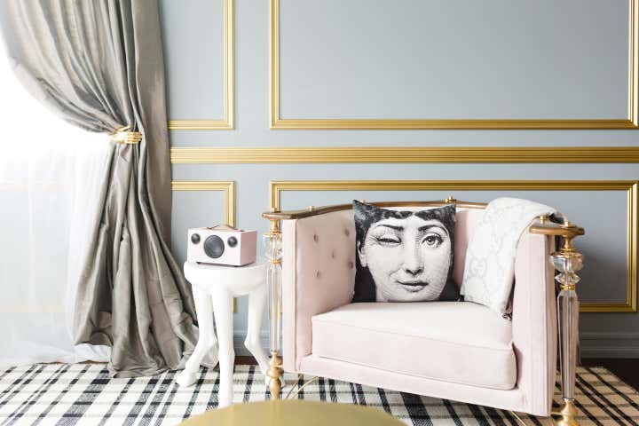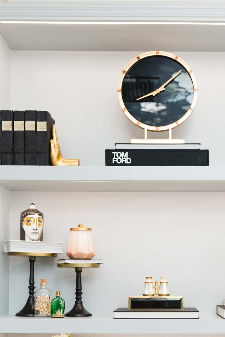 A fun, fashion-forward client wanted an eclectic office oasis to inspire her and with one mandatory request — a champagne fridge. Inspiration originated from classic interiors with a modern twist. Notable bespoke pieces include a custom curved desk with repurposed vintage cast iron Singer legs, a sophisticated Nick Alain lounge chair, bold floral wallpaper, imported crown moulding, a concealed champagne fridge and commissioned art. Vintage and heirloom objects from the client’s own collection are showcased on the illuminated built-ins.