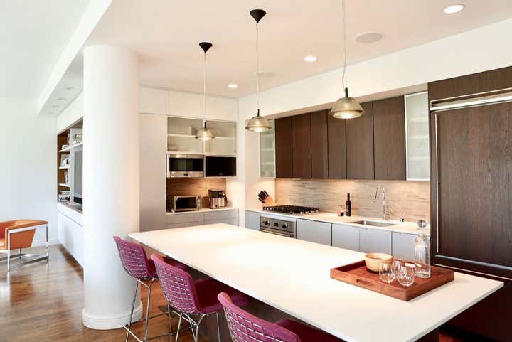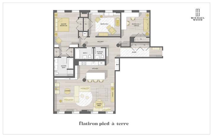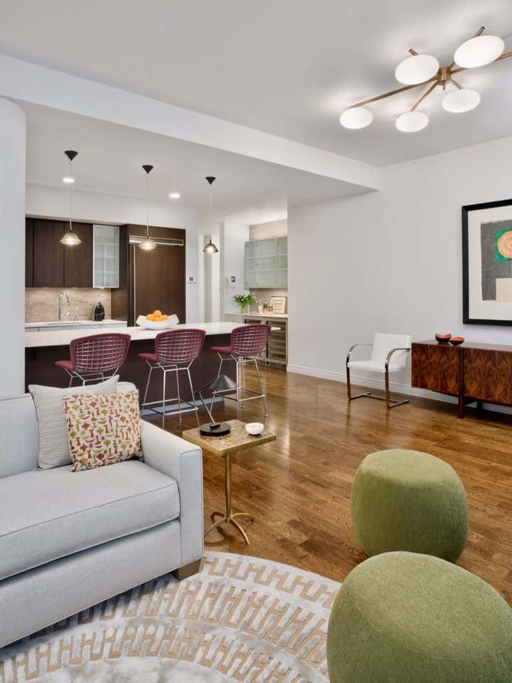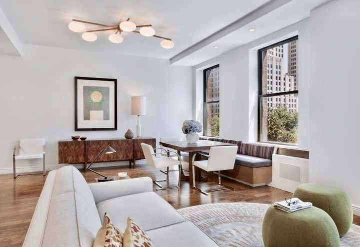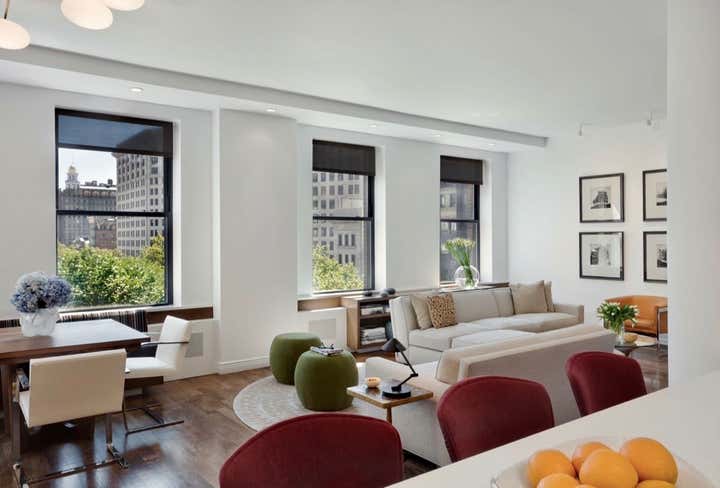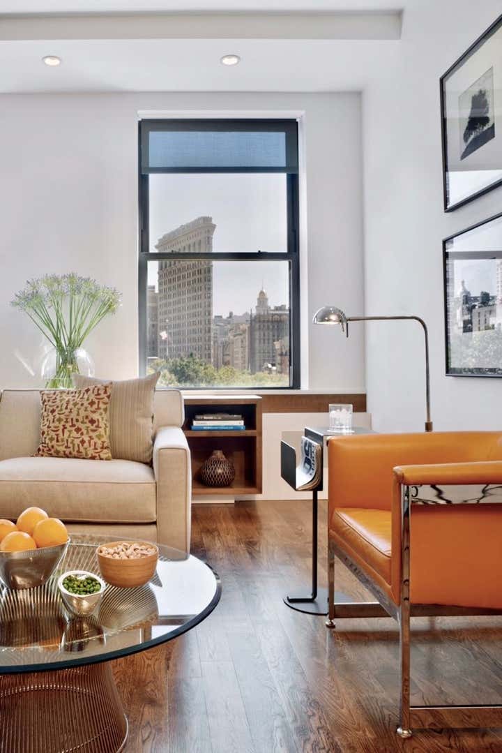 Vintage and new furnishings are upstaged by a postcard view of Madison Square Park.