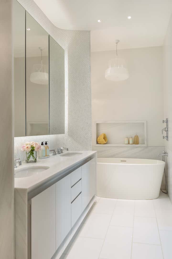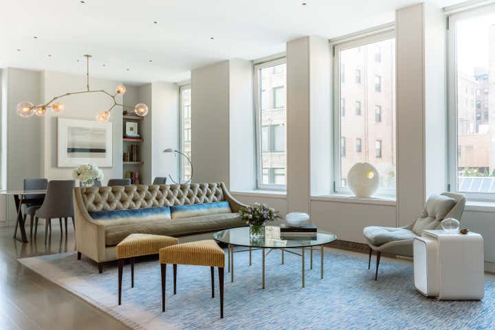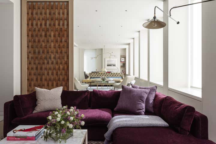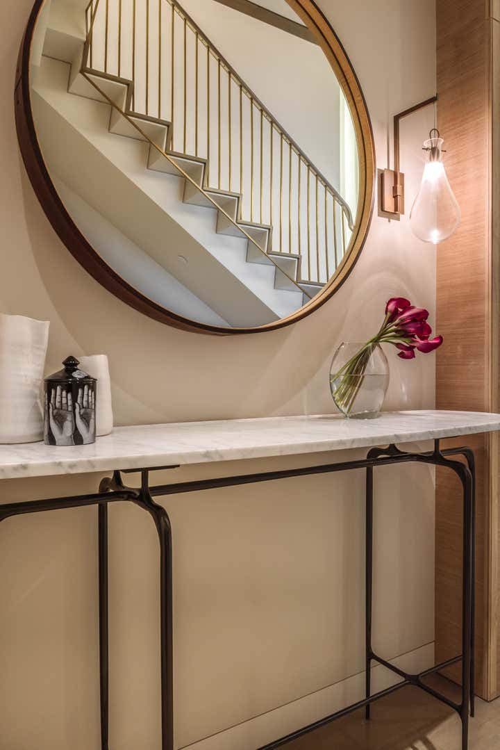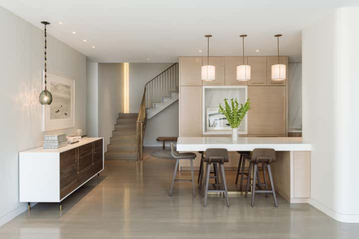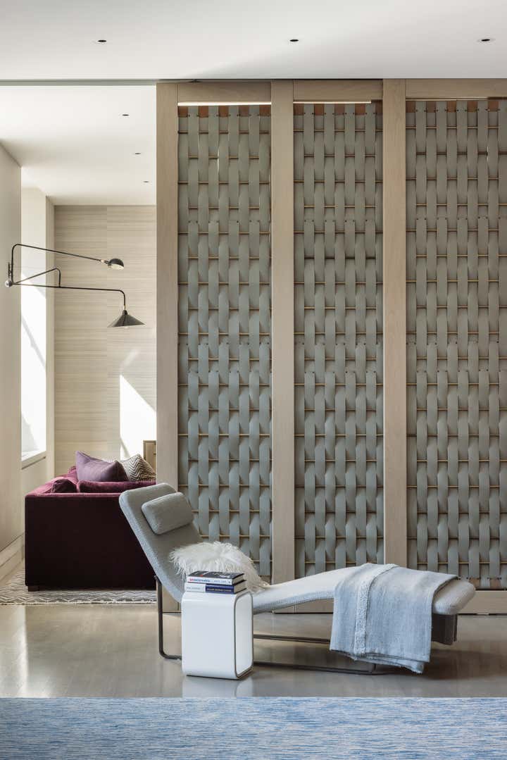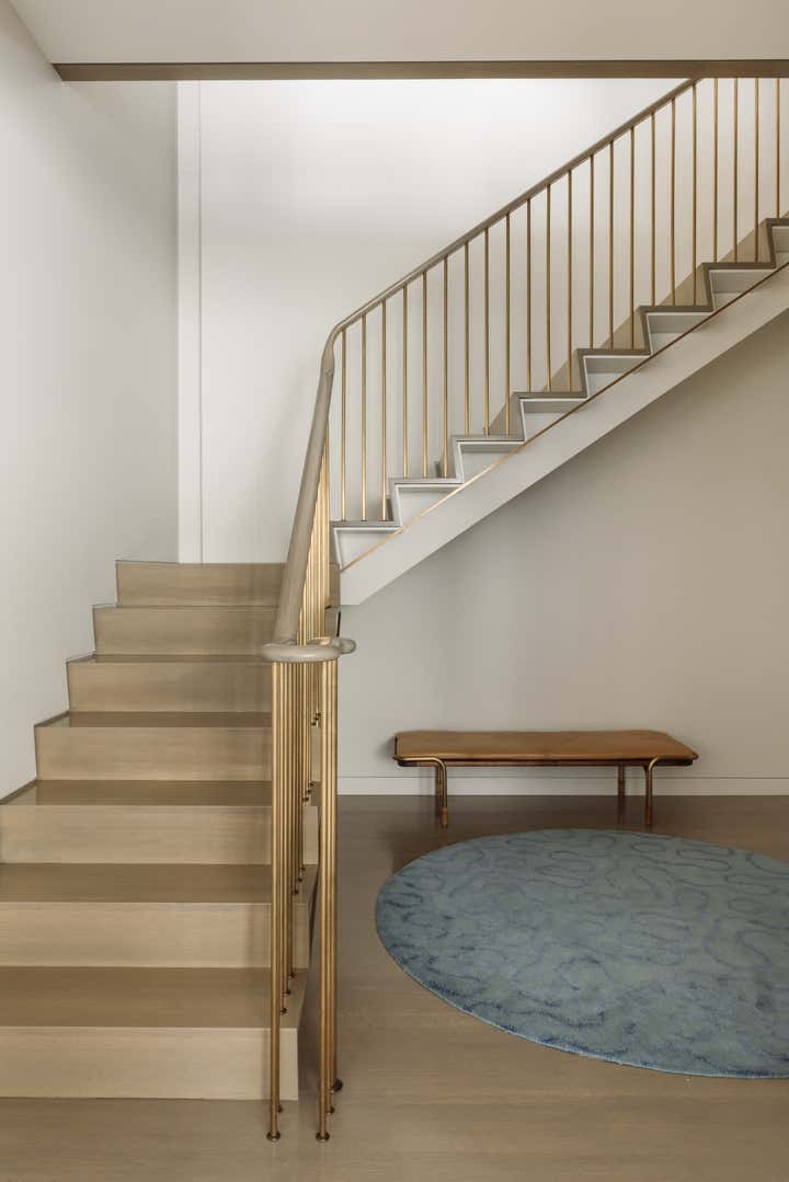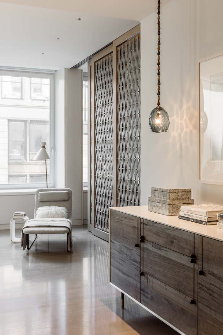 This classic loft building features the Flatiron Residence, features large windows and soaring ceiling heights. This was a perfect project for a young growing family who wanted to create a luminous, spacious home. They combined two floors and opted for a sun drenched, generous layout designed to maintain as much openness as possible throughout the residence. The overall feeling is fresh, contemporary and artisan. Their custom kitchen anchors the main floor’s loft space while the dining, living and family rooms flow together. The rooms are separated only by a full height woven-leather sliding panel system. This was integrated to give the owners flexibility in open or closed doors depending on how they’re occupying the space on any given day. The stair’s sculptural bronze and white oak finishes quietly integrate the two floors, with cove lighting and an artisan glass chandelier illuminating the area.