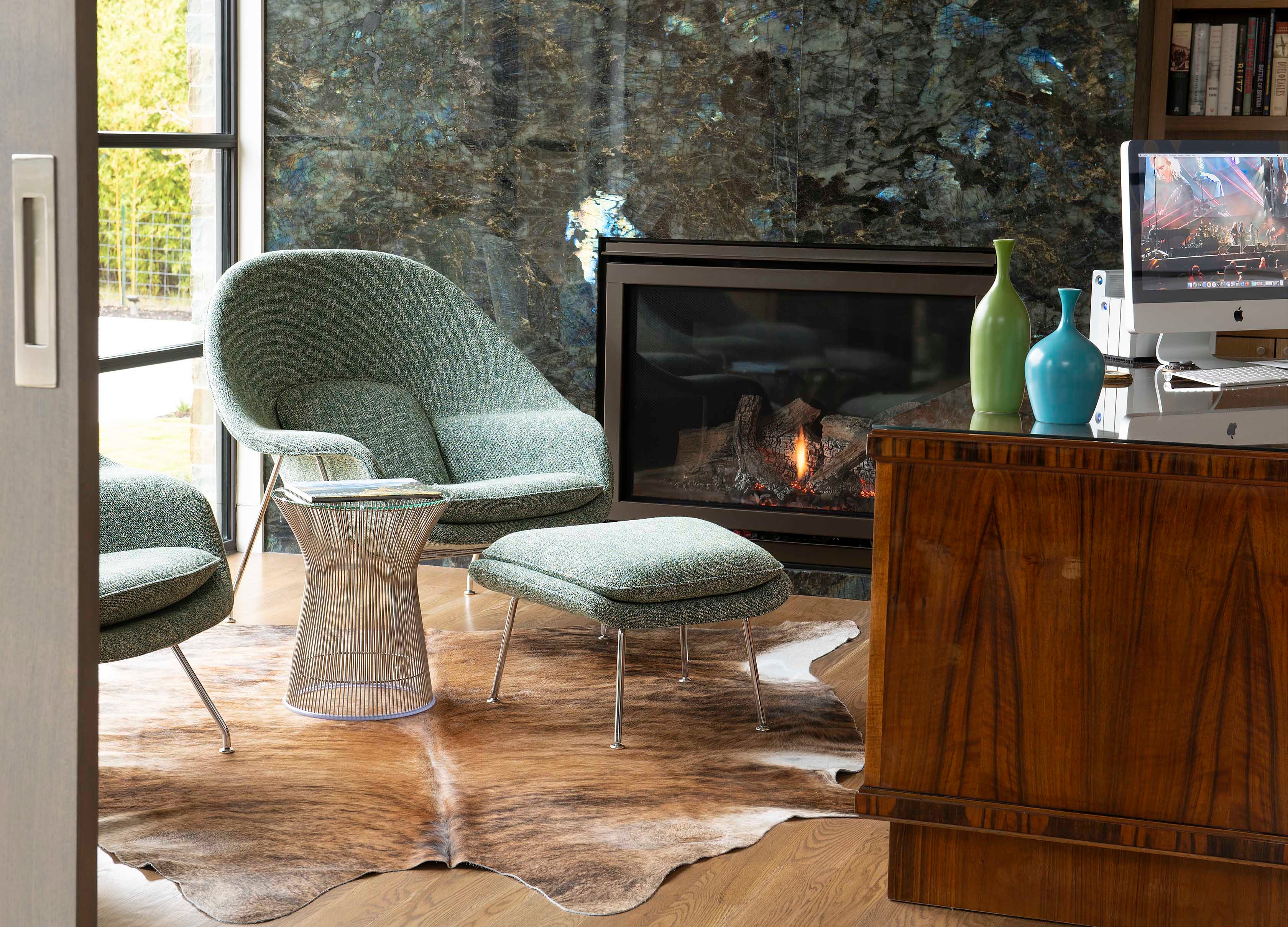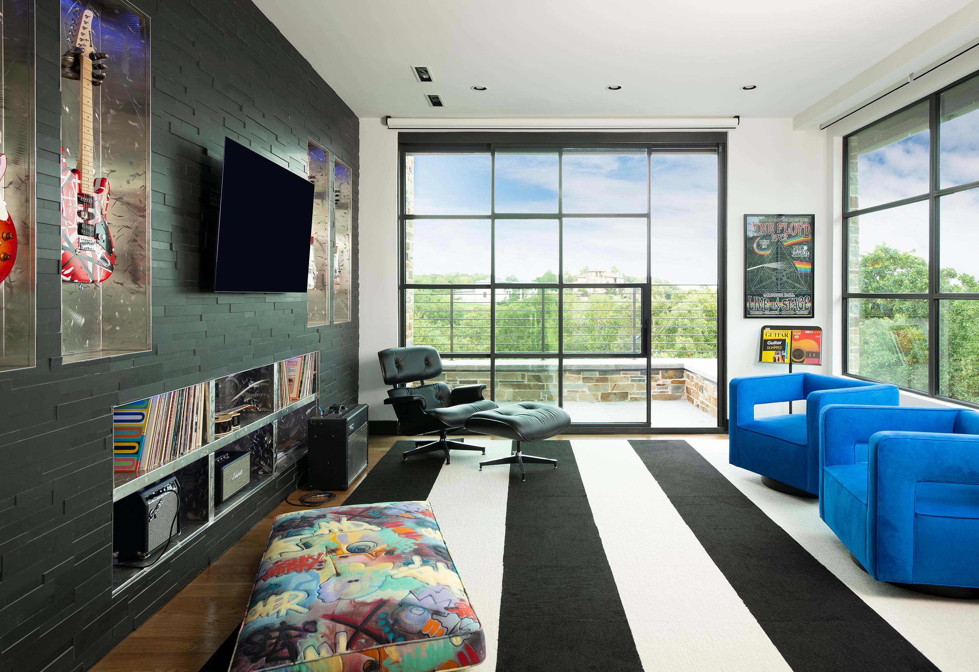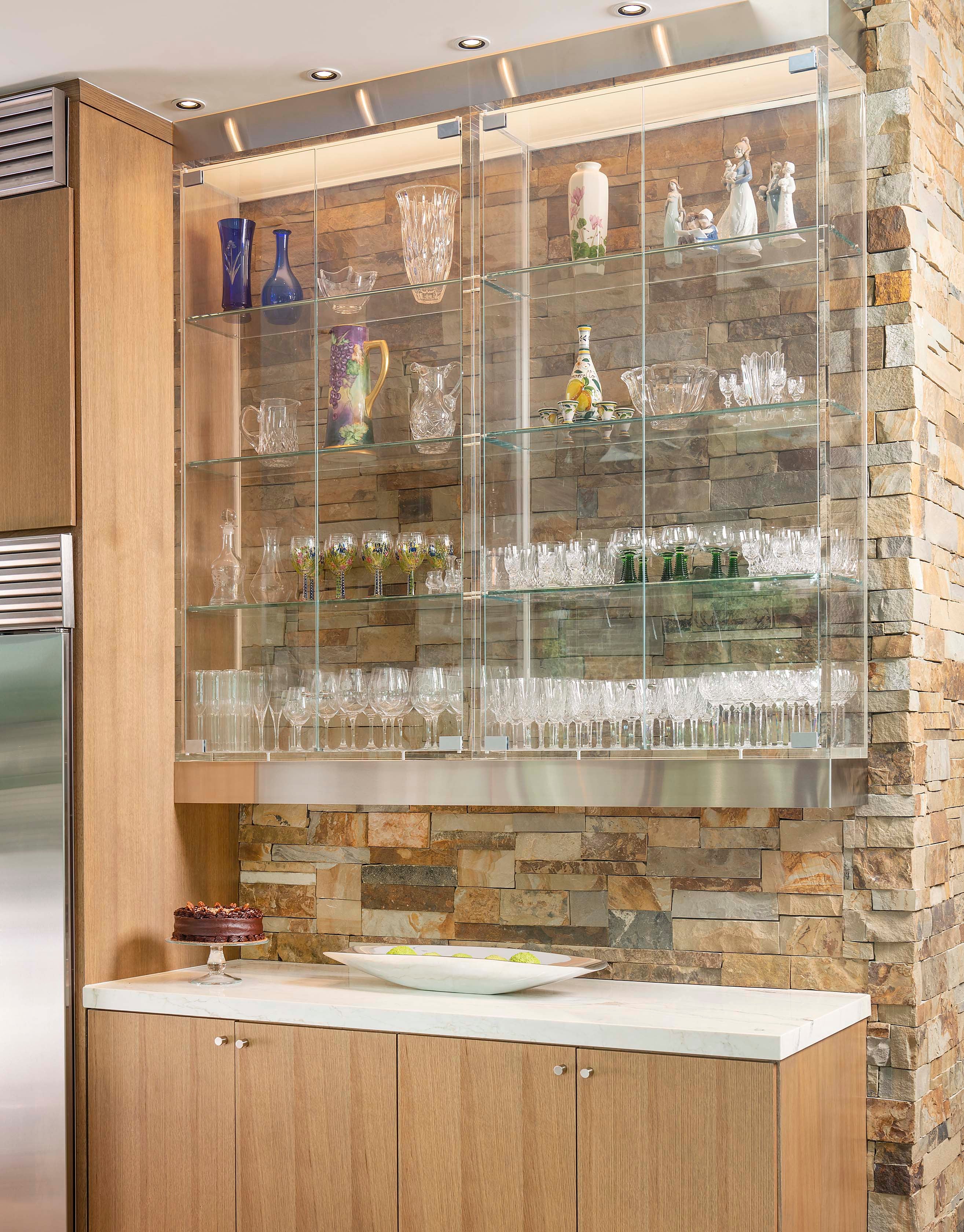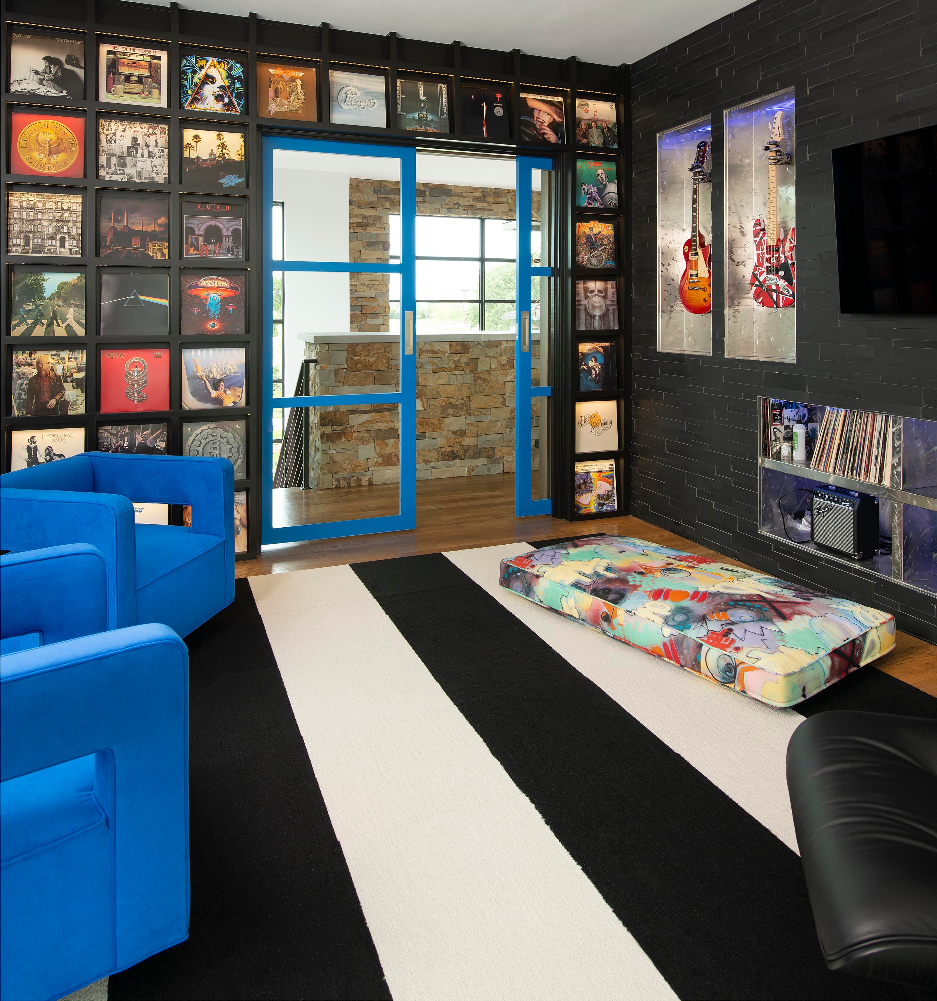 The result of a three-year collaboration between the client and Mary Anne Smiley, the client’s new 8000 square foot home celebrates the dream home come true. Open space with broad vistas of the verdant landscape provides an inviting home to entertain family and friends in comfort and style. Streamlined contemporary design incorporates a balance in textural materials from rough rock to smooth glass and steel; and sumptuous upholstery contrasted with colorful cowhide and acrylic. The glass enclosed wine room, the music room with custom display wall for a vintage vinyl collection, and an acrylic and glass wall hung cabinet for glassware are just a few of the unique custom designs created by the designer.