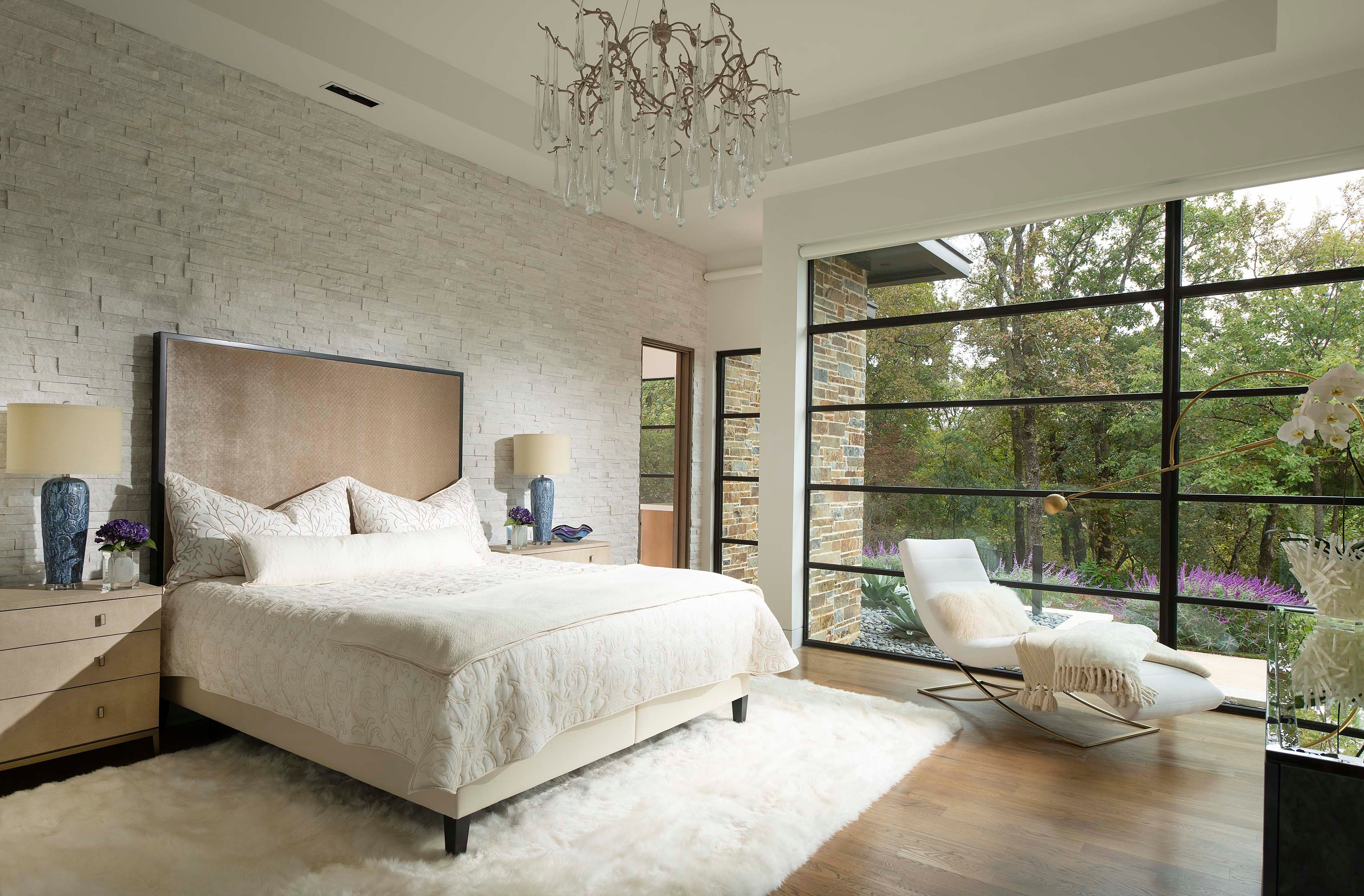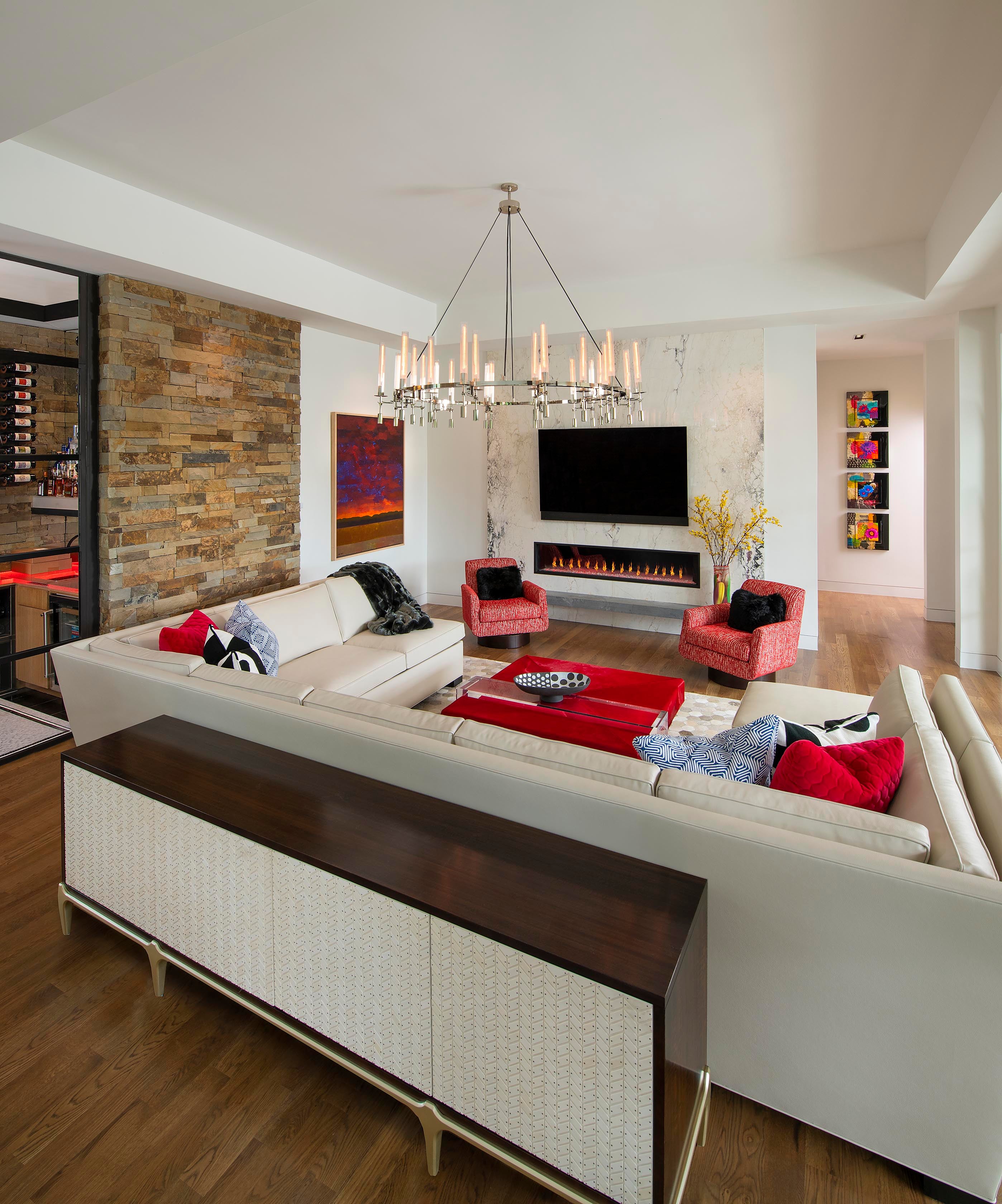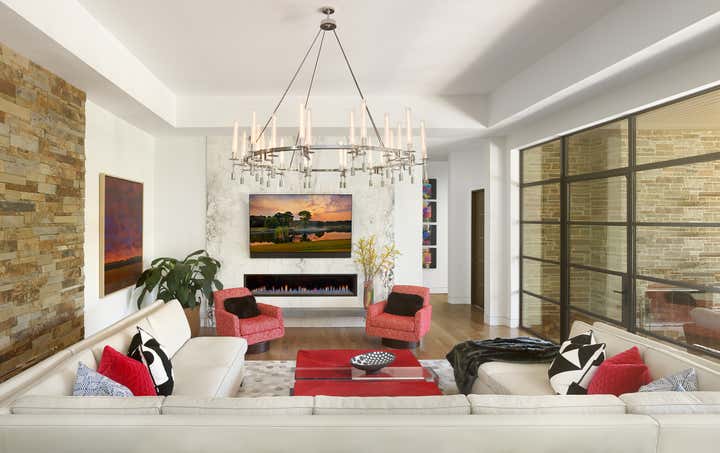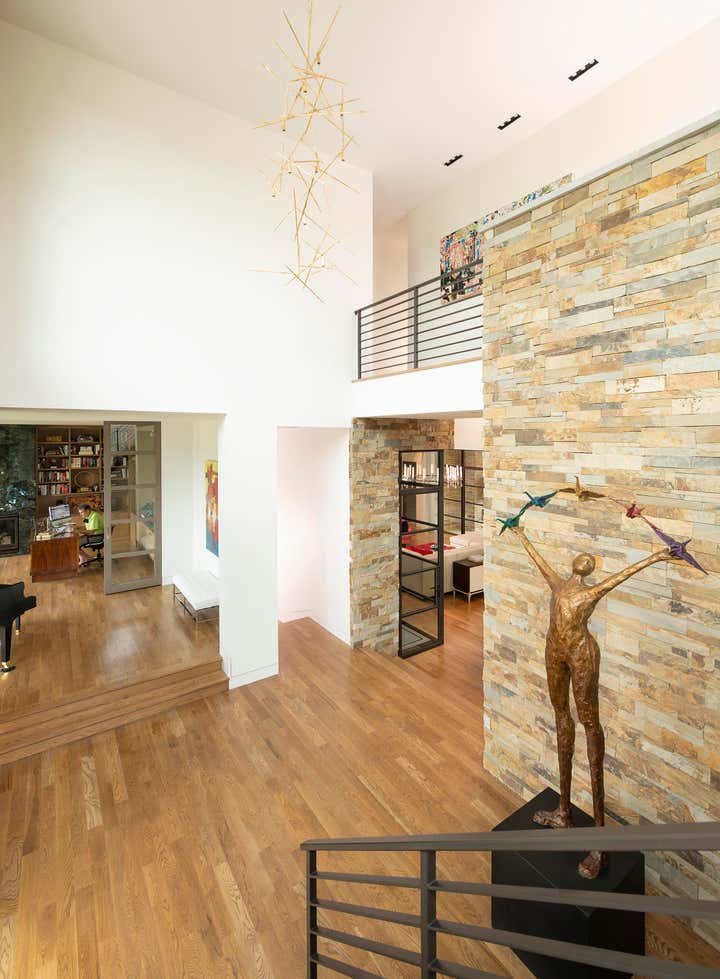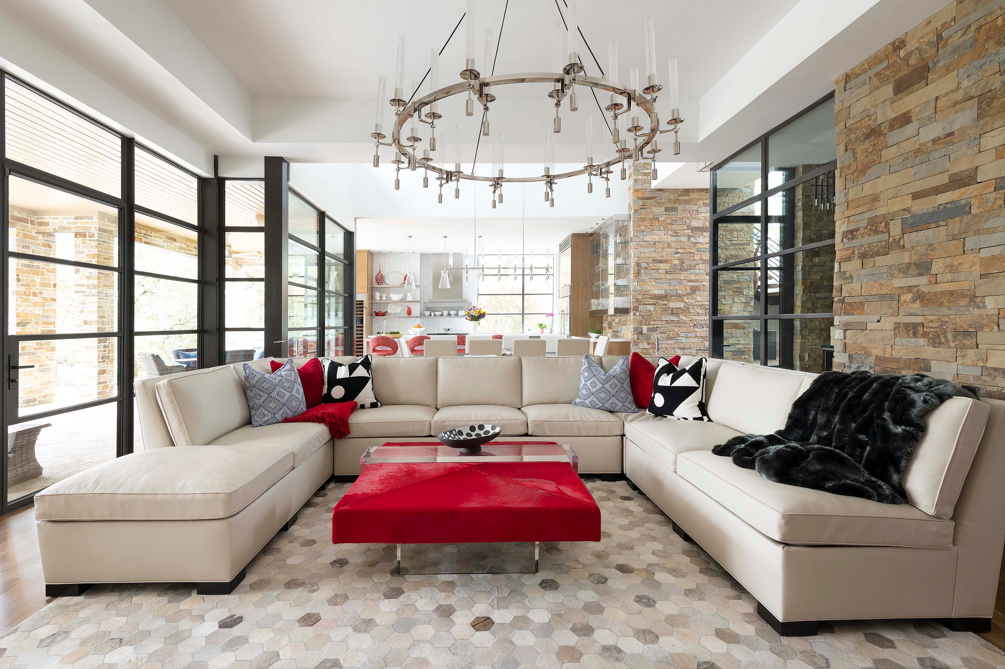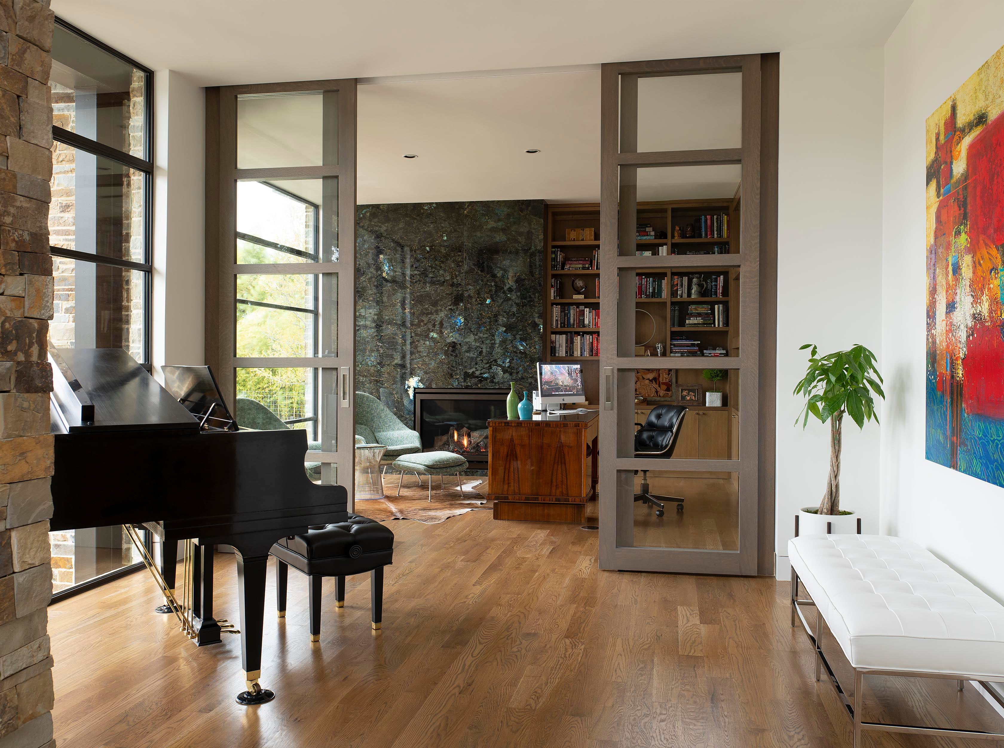 The result of a three-year collaboration between the client and Mary Anne Smiley, the client’s new 8000 square foot home celebrates the dream home come true. Open space with broad vistas of the verdant landscape provides an inviting home to entertain family and friends in comfort and style. Streamlined contemporary design incorporates a balance in textural materials from rough rock to smooth glass and steel; and sumptuous upholstery contrasted with colorful cowhide and acrylic. The glass enclosed wine room, the music room with custom display wall for a vintage vinyl collection, and an acrylic and glass wall hung cabinet for glassware are just a few of the unique custom designs created by the designer.