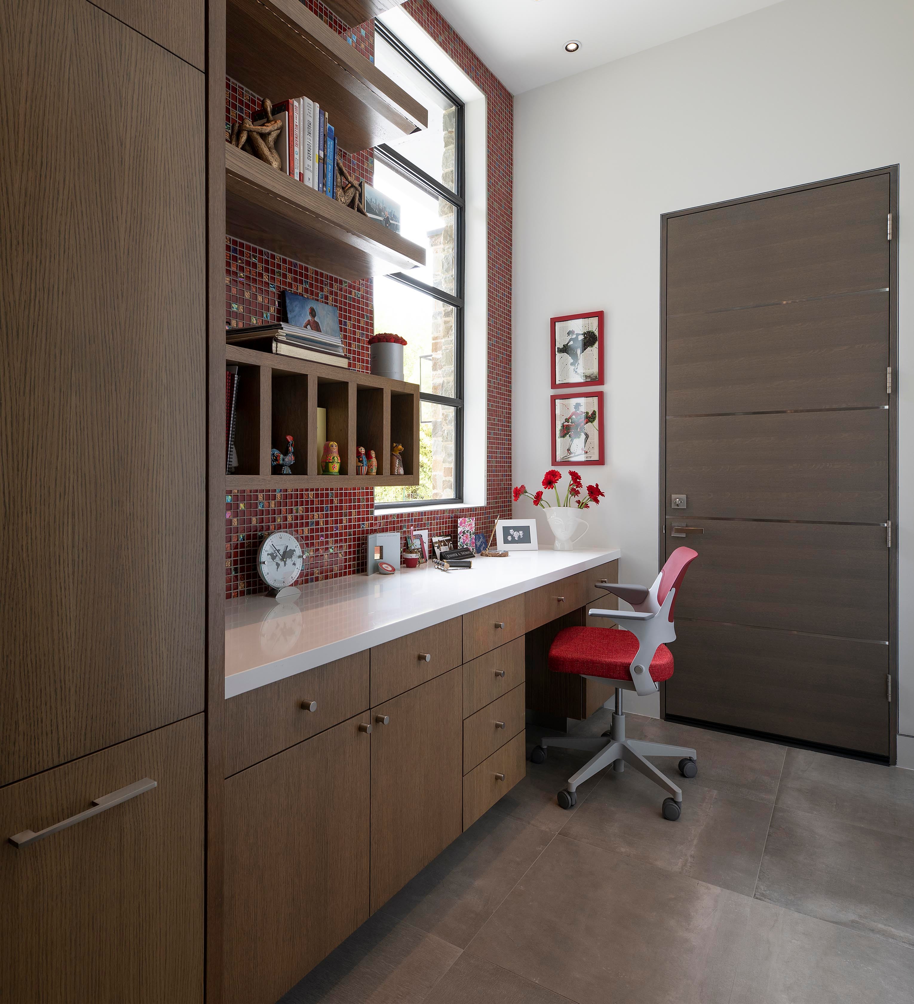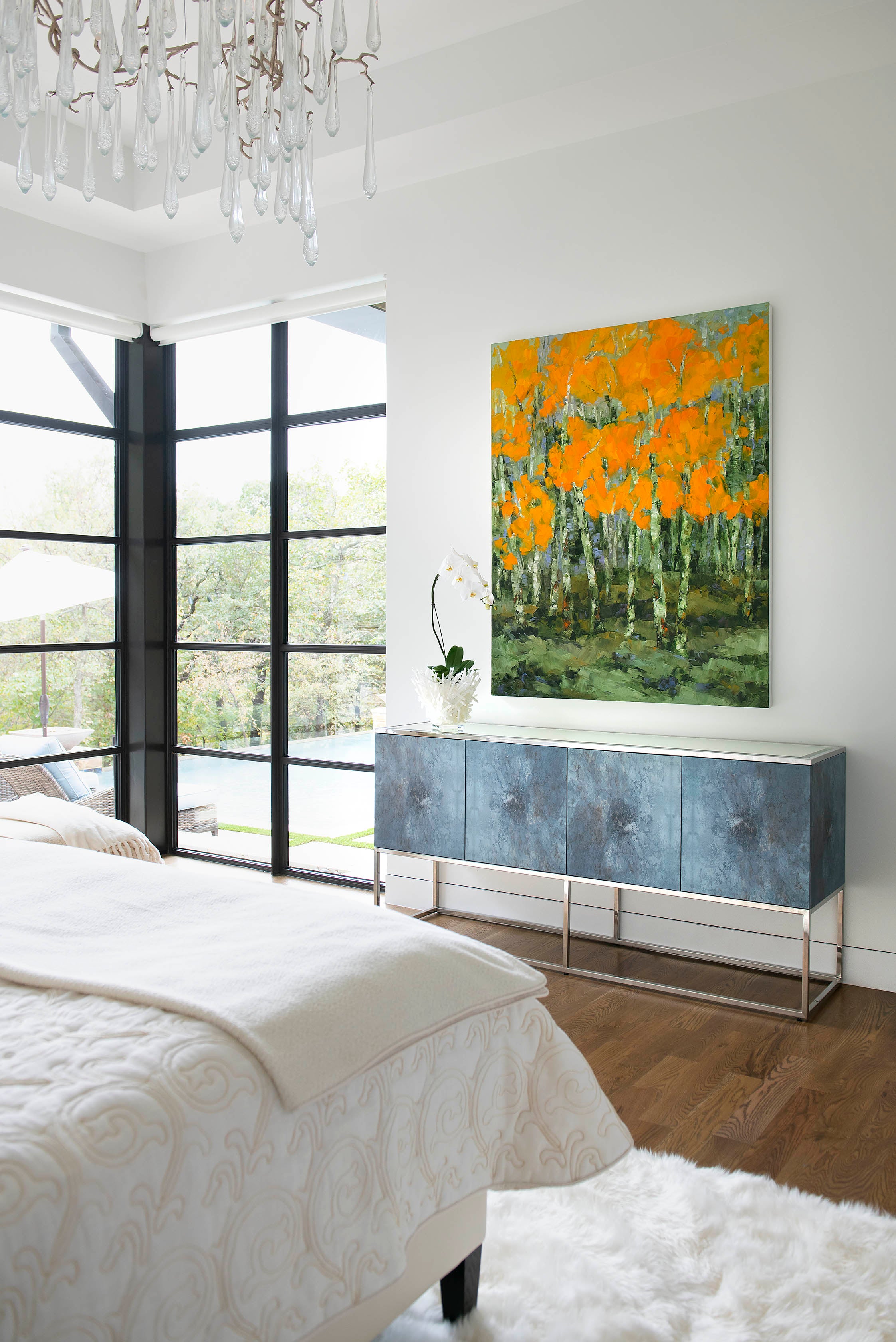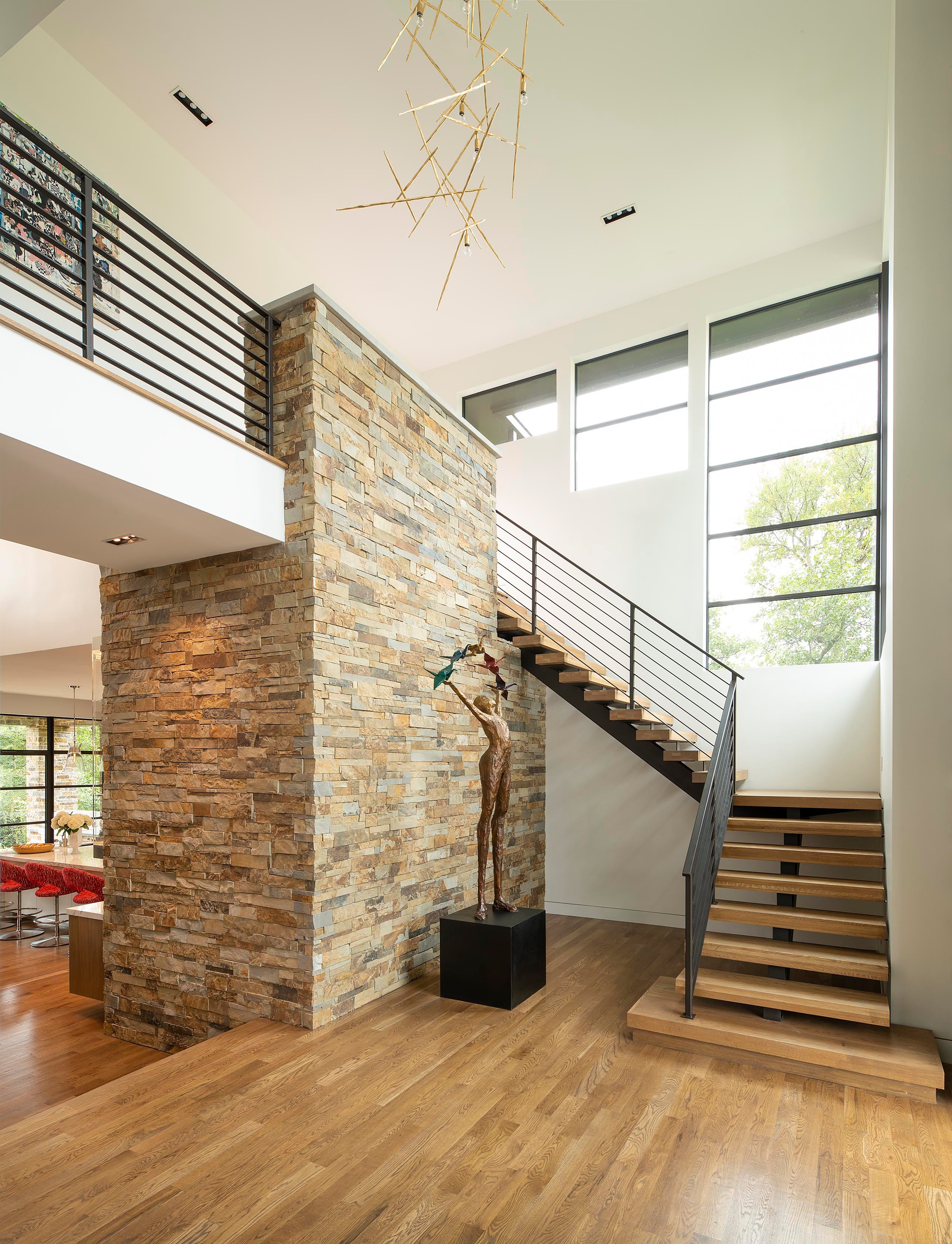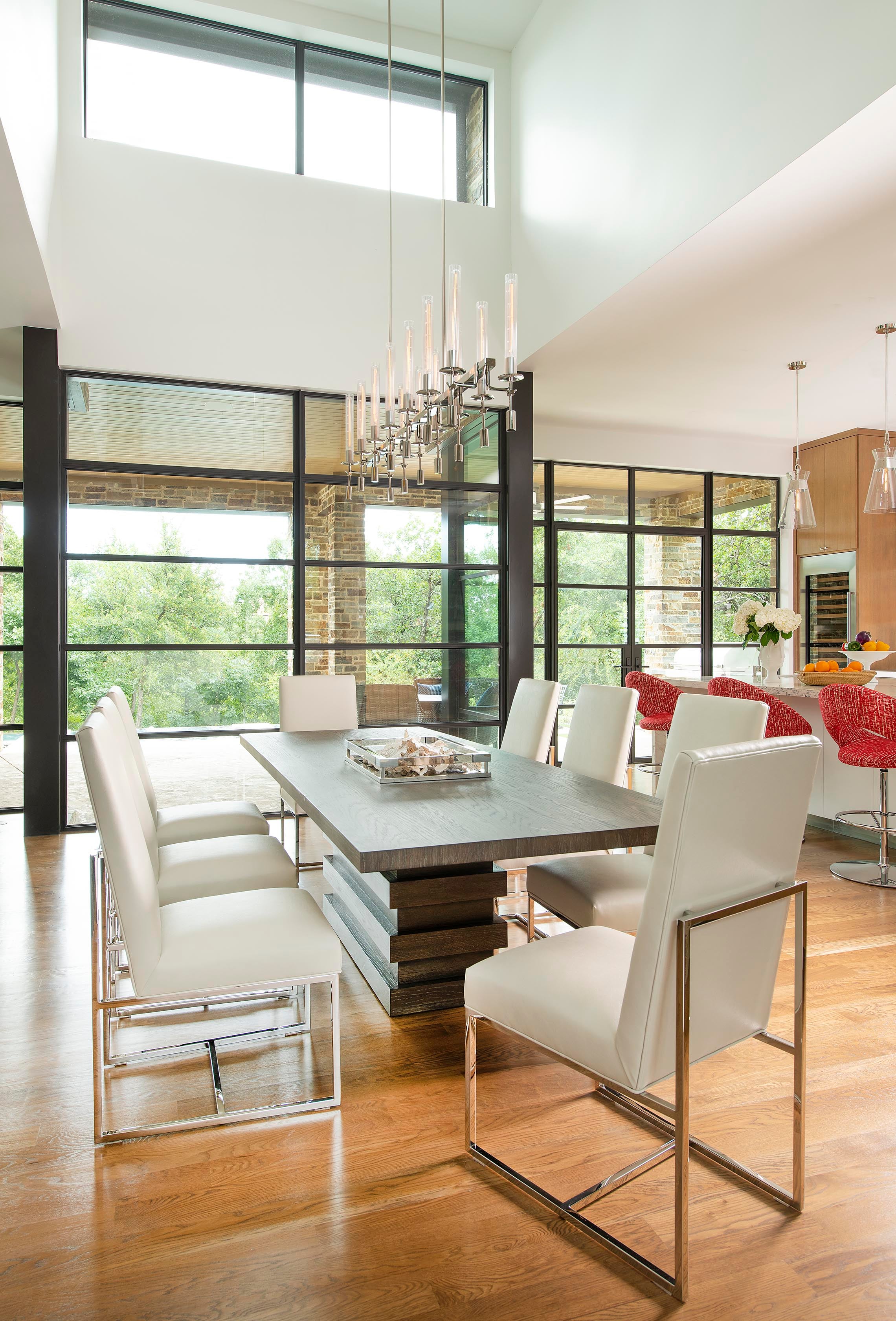 The result of a three-year collaboration between the client and Mary Anne Smiley, the client’s new 8000 square foot home celebrates the dream home come true. Open space with broad vistas of the verdant landscape provides an inviting home to entertain family and friends in comfort and style. Streamlined contemporary design incorporates a balance in textural materials from rough rock to smooth glass and steel; and sumptuous upholstery contrasted with colorful cowhide and acrylic. The glass enclosed wine room, the music room with custom display wall for a vintage vinyl collection, and an acrylic and glass wall hung cabinet for glassware are just a few of the unique custom designs created by the designer.