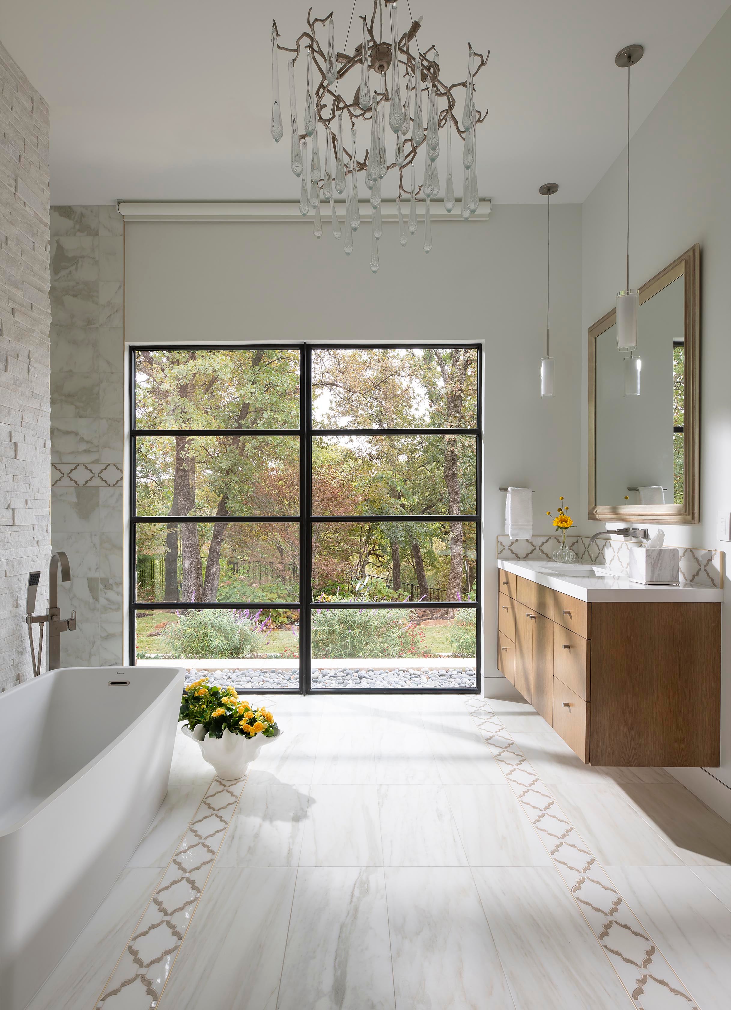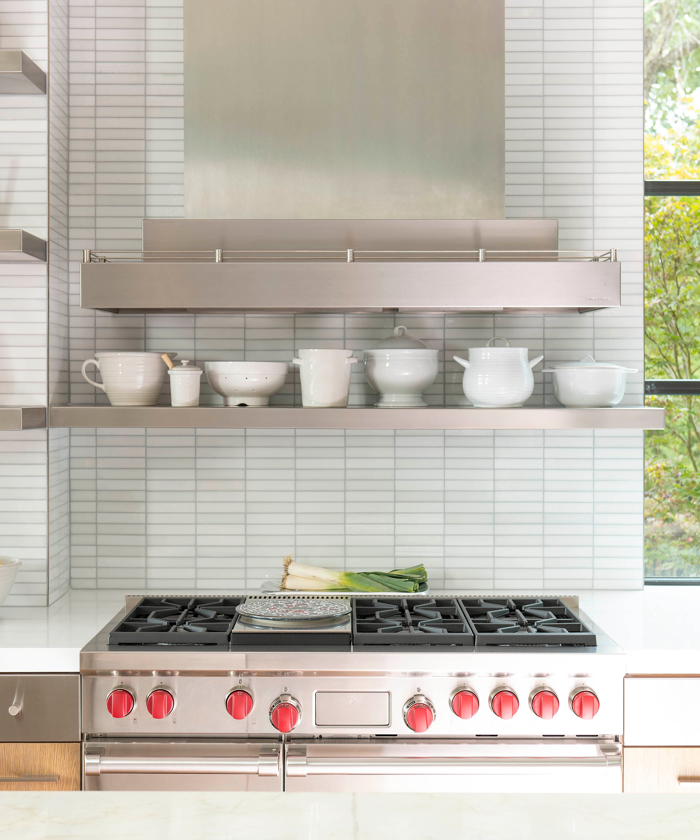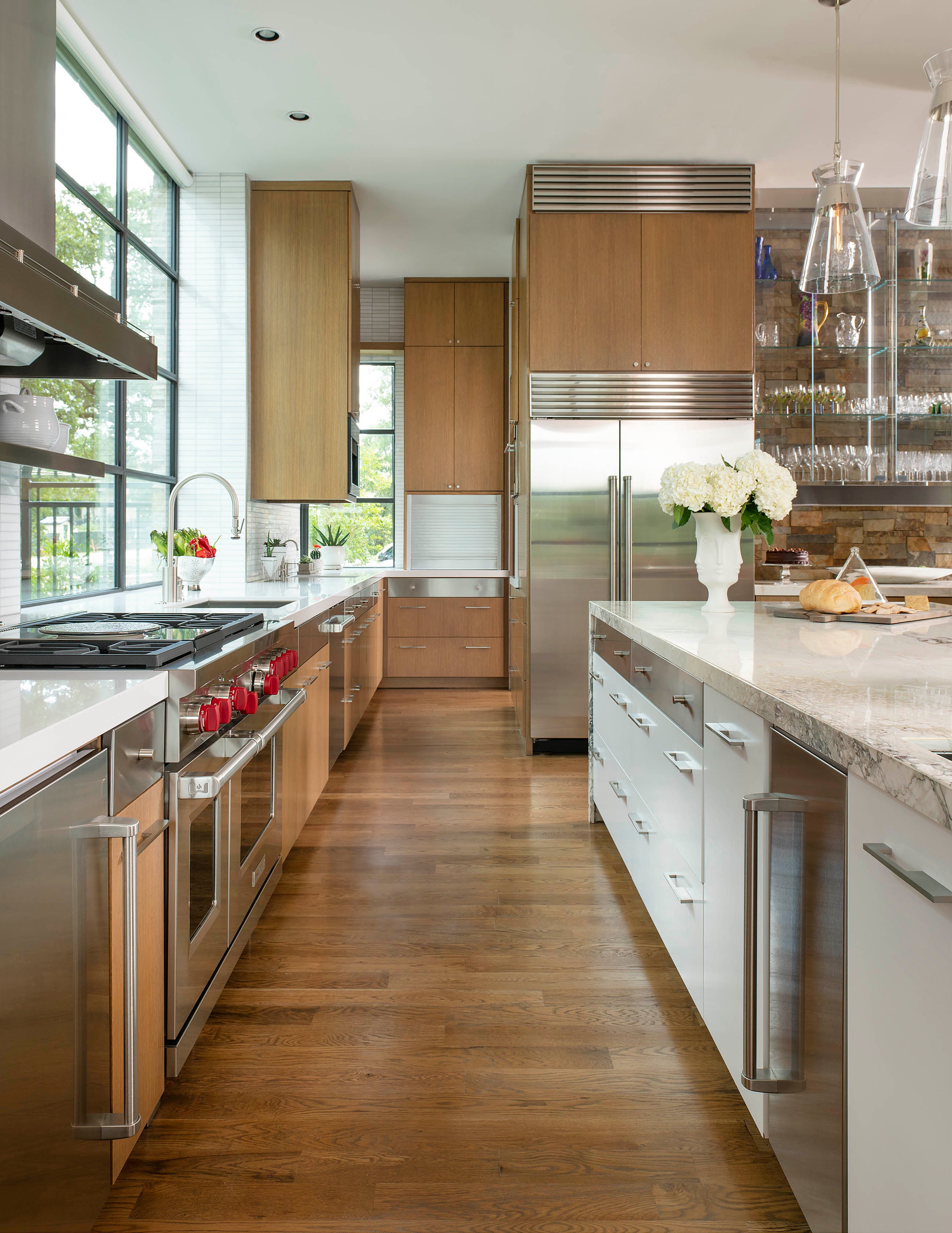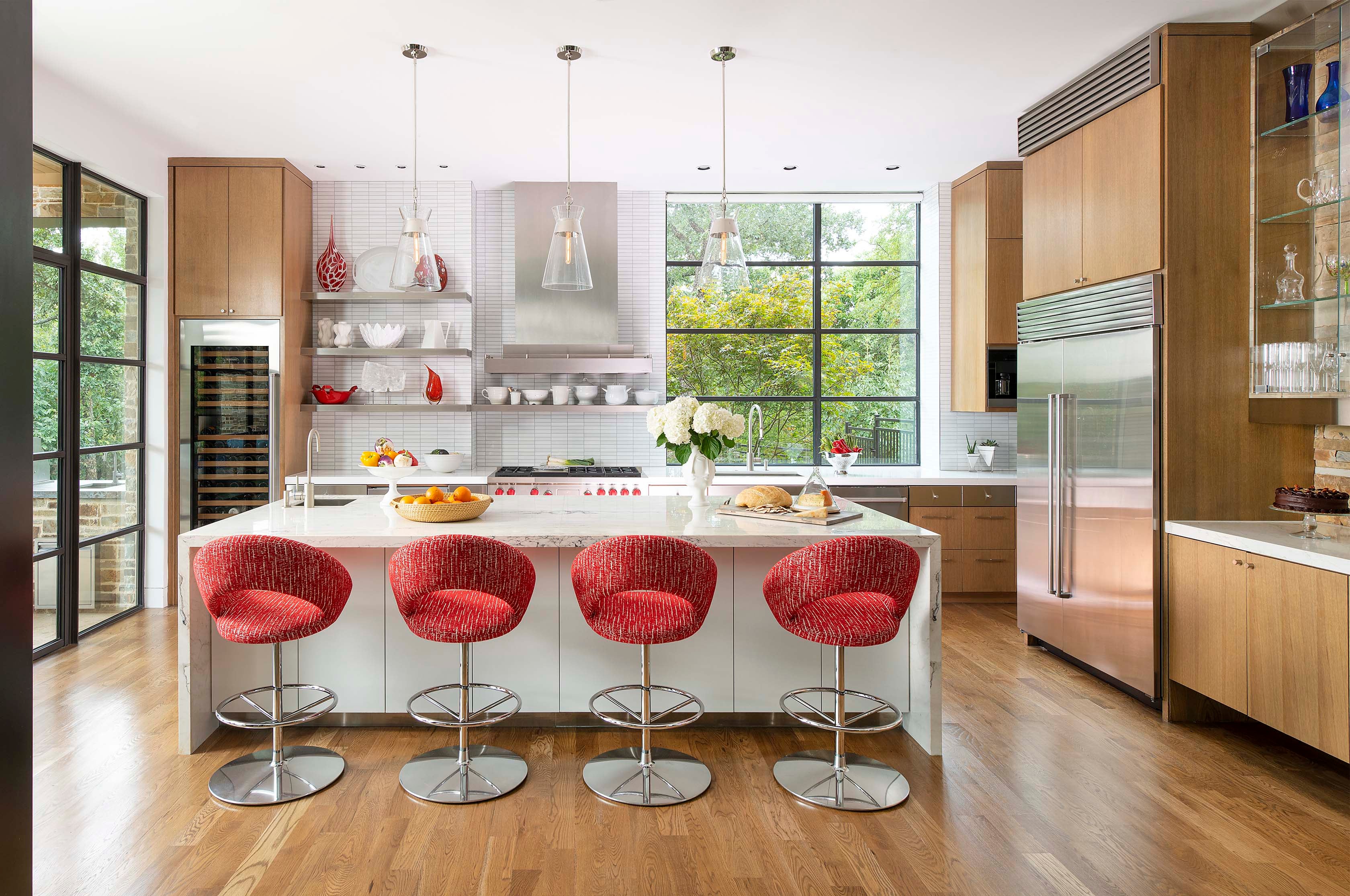 The result of a three-year collaboration between the client and Mary Anne Smiley, the client’s new 8000 square foot home celebrates the dream home come true. Open space with broad vistas of the verdant landscape provides an inviting home to entertain family and friends in comfort and style. Streamlined contemporary design incorporates a balance in textural materials from rough rock to smooth glass and steel; and sumptuous upholstery contrasted with colorful cowhide and acrylic. The glass enclosed wine room, the music room with custom display wall for a vintage vinyl collection, and an acrylic and glass wall hung cabinet for glassware are just a few of the unique custom designs created by the designer.