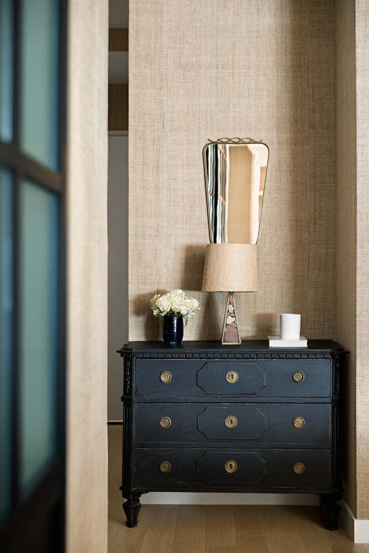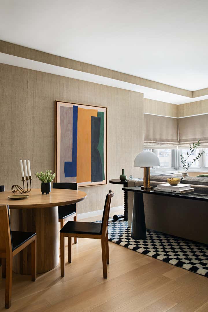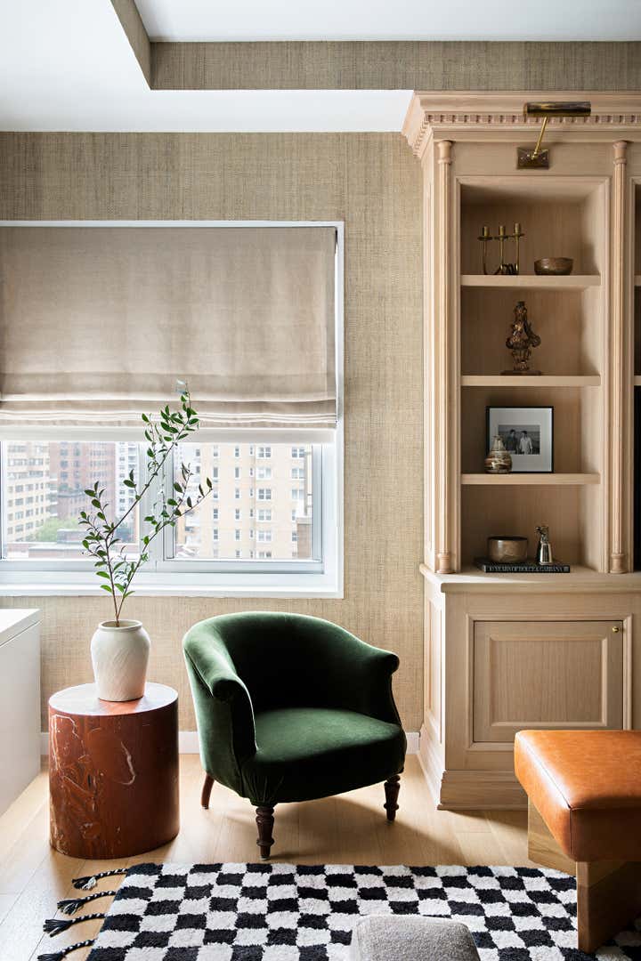 While working on our clients primary residence in Massachusetts, they asked the design firm to turn their spartan pied-a-terre in New York City into a comfortable living space for their regular commutes to the city. Custom oak millwork, inviting velvet upholstery, and grasscloth wallcovering provide warmth and texture to the apartment, which also often hosts visiting family members.