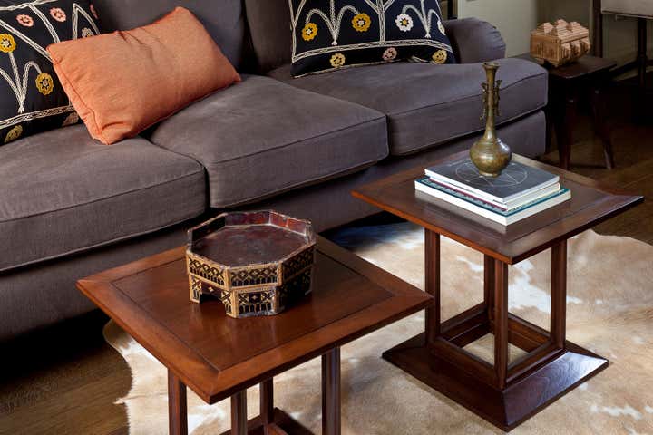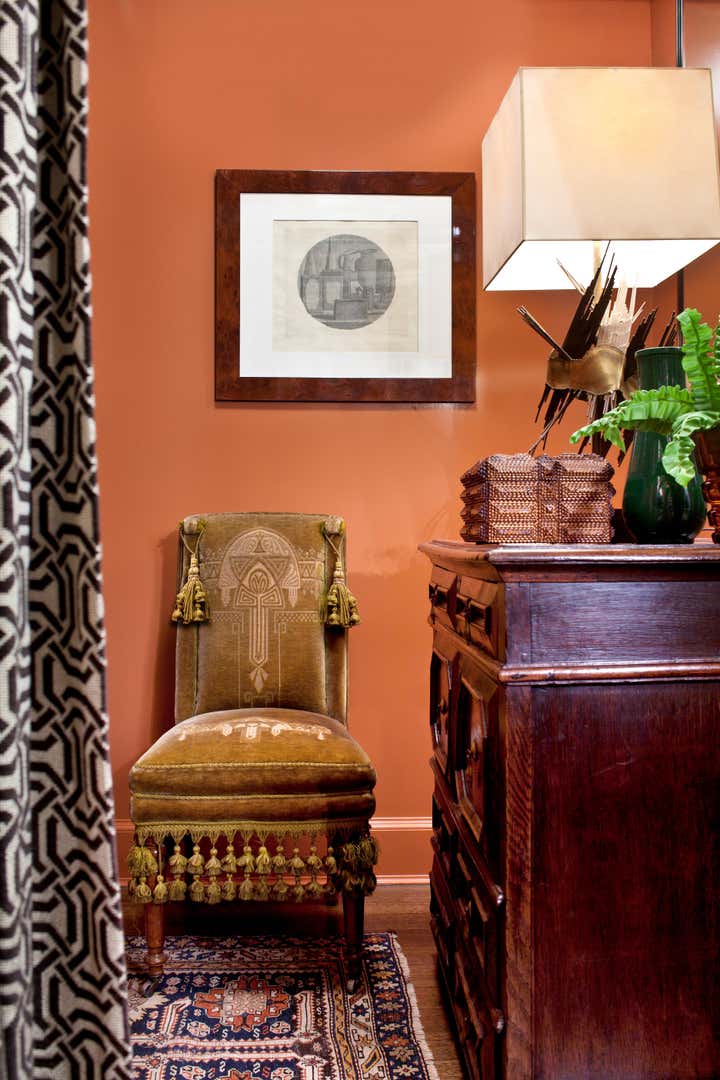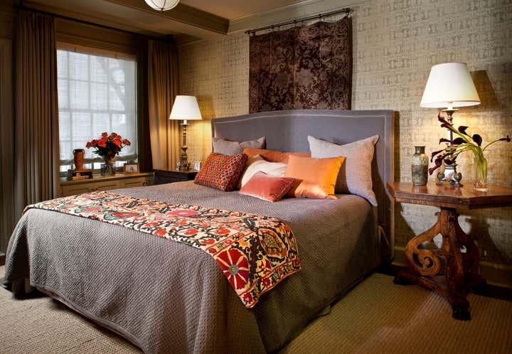 The clients were very interested in vintage textiles, so we introduced layering of Persian rugs and embroidered or tapestry wall-hangings. A selection of patterned textiles, woven or embroidered rather than printed, and often antique in appearance, are carefully juxtaposed. Many of the upholstery and pillow fabrics are actually new, but they have a luscious, aged look.
