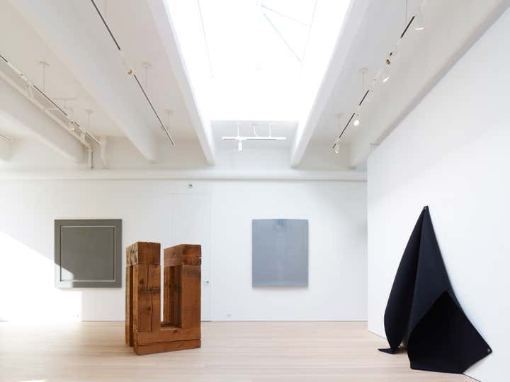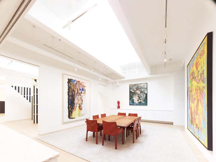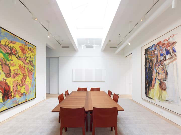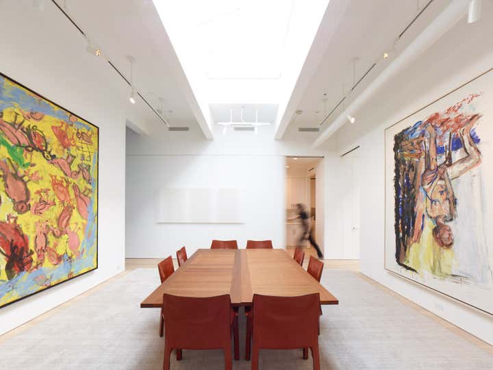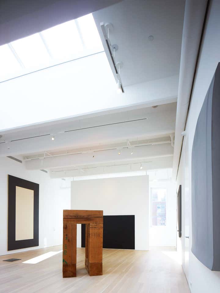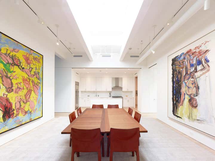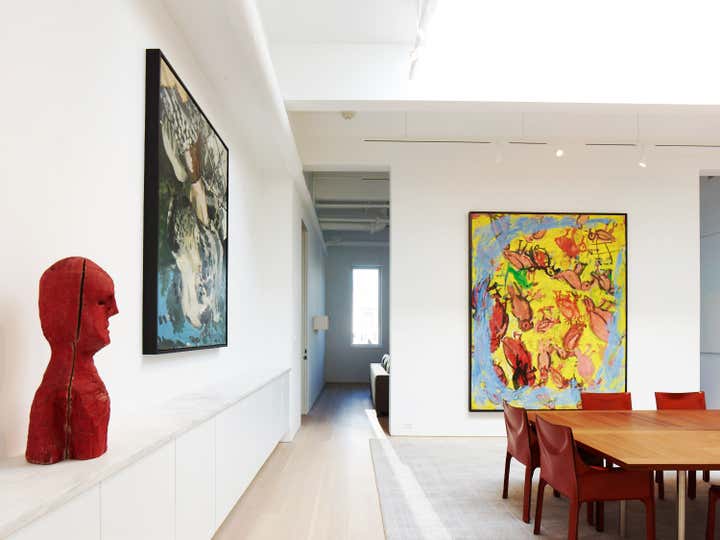 This Penthouse sits atop a 1920-era building perching directly over New York’s well known High-Line garden promenade. The apartment, designed for two avid art collectors, is defined by a central rectangle with moving walls for art display, with ancillary rooms connecting off of it. The front of the space houses an art foundation’s offices and a long, skylit gallery, which can be subdivided off from the family areas of the dining, kitchen, and living room. The apartment’s walls are designed for maximum flexibility, shifting and changing the collection per the owners direction. Ten foot tall sliding doors allow the space to be segmented off in three sections to subdivide the public from the private, or to host a large scale exhibition. The bright, natural light-filled gallery is an ideal spot to showcase large installation art projects. With eggshell white walls and complimentary furniture, every room in this penthouse holds the potential of becoming a gallery. A key feature of the design is the ten foot by fifteen foot moving wall that hides or reveals the kitchen. As the wall shifts, so does the collection, revealing new art and changing room instantly with the push of a finger. A hidden door allows access to the kitchen when closed.