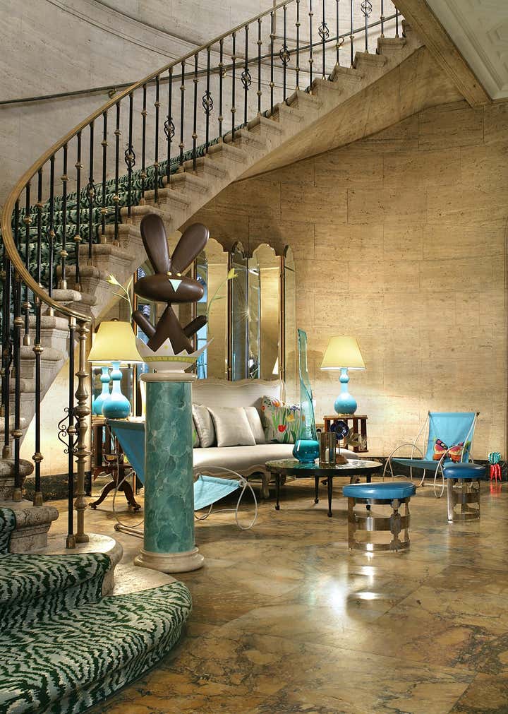 For the inaugural Holiday House for the Susan Komen Breast Cancer Foundation in 2008, we designed with a holiday in mind as inspiration and ours was Easter. It really all started with an illustration my friend the late Robert de Michiell did, after we had talked on the phone and discussed the concept. I had told him I ideally wanted a chocolate bunny coming out of an egg as a sculpture and he incorporated it in the sketch of the room. The amazing artists at The Alpha Workshops took the illustration and rendered the bunny in 3D, as a real chocolate bunny would likely not have survived the event.... C.J. Peters had an extraordinary, tall vintage mirrored screen, which we used to bring in the views from the courtyard and light! A slightly curved vintage sofa, antique side tables from Florian Papp, turquoise French metal garden chairs from Magen H Gallery, turquoise ceramic lamps from Christopher Spitzmiller, a huge turquoise mid century glass vase found on a flea market, a French 1950 s ceramic table from Studio Van Den Akker and vintage turquoise leather and chrome stools made for an easter egg of a room and when we didn t like an outlet in the baseboard to be visible, it was covered with a tole carrot bunch we found downtown.... And it just so happened that Stark Carpet had a fabulous faux bois runner in perfect colors to go up the stairs. Although this installation happened a long time ago, the photos taken are amongst the best we have of our work thank you Peter Rymwid!