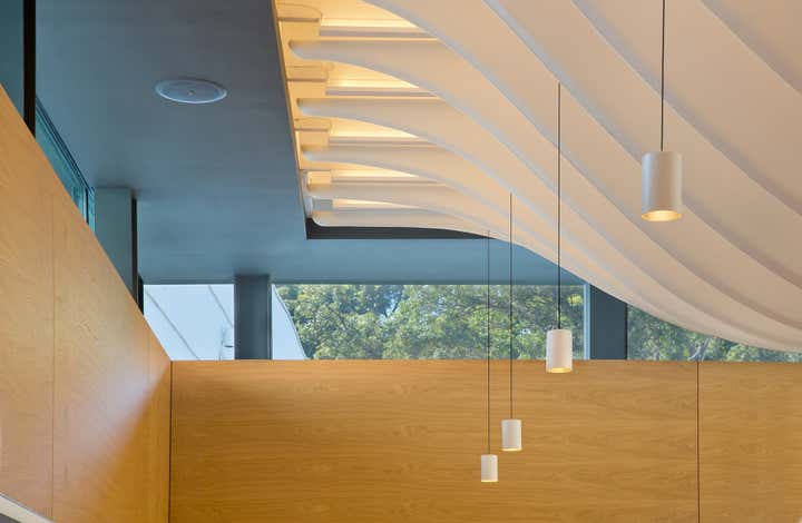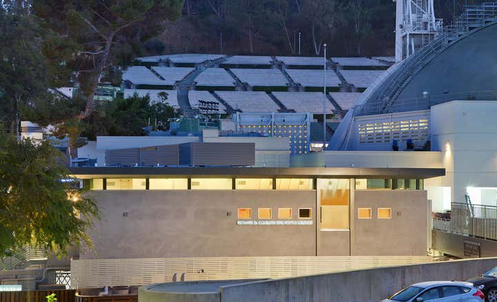 Prior to taking center stage at the Hollywood Bowl, Los Angeles Philharmonic Orchestra members now have a quiet, comfortable, and creative place to relax. Cork floors and white-oak-paneled walls provide to a feeling of natural calm that contrasts with the high drama of the Hollywood Bowl stage. Built 15 years ago with the plan to replace it after one year, a renovation was long overdue. To make it feel like a private lounge instead of a multipurpose space, we raised the roof by adding a new steel structure, making the interior tall, day-lit, and airy. Clerestory windows allow views of the surrounding hillside and a series of acoustical felt panels on the underbelly of the exposed roof beams turn the ceiling into a sculptural piece that unifies the entire space. The panels’ changing curvature pays homage to the scalloped and layered shell of the stage, while also adding energy to the space. A decorative screen was added to the building’s exterior, amplifying the building’s presence.