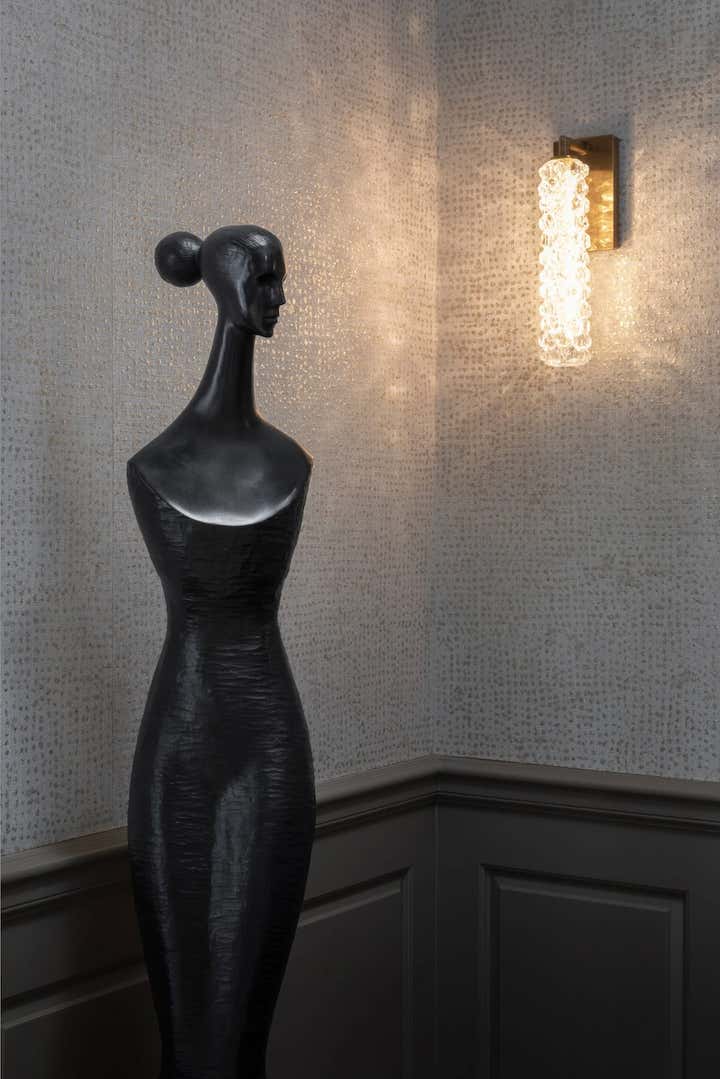 Unique details like Murano glass and gold and silver leaf add inherent glamour. A pearlescent texture guides visitors to the second floor. The Murano chandelier s brightness glimmers leading to the mural of nature that speaks of celestial plants, birds, and flowers. Ornamental tassels from sixteenth century France and Art Déco trimmings blend together. This curated design revives the property s soul to its original majesty.