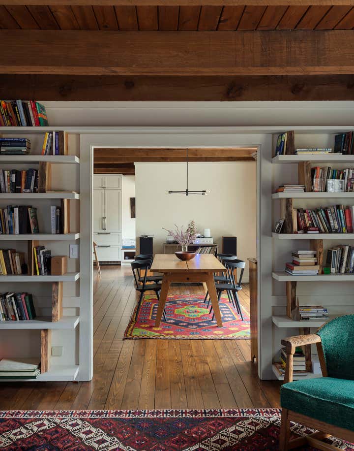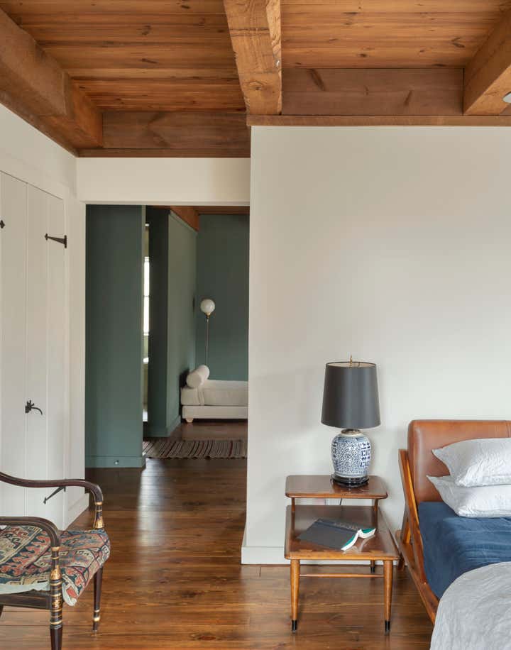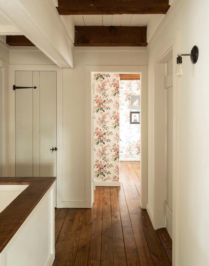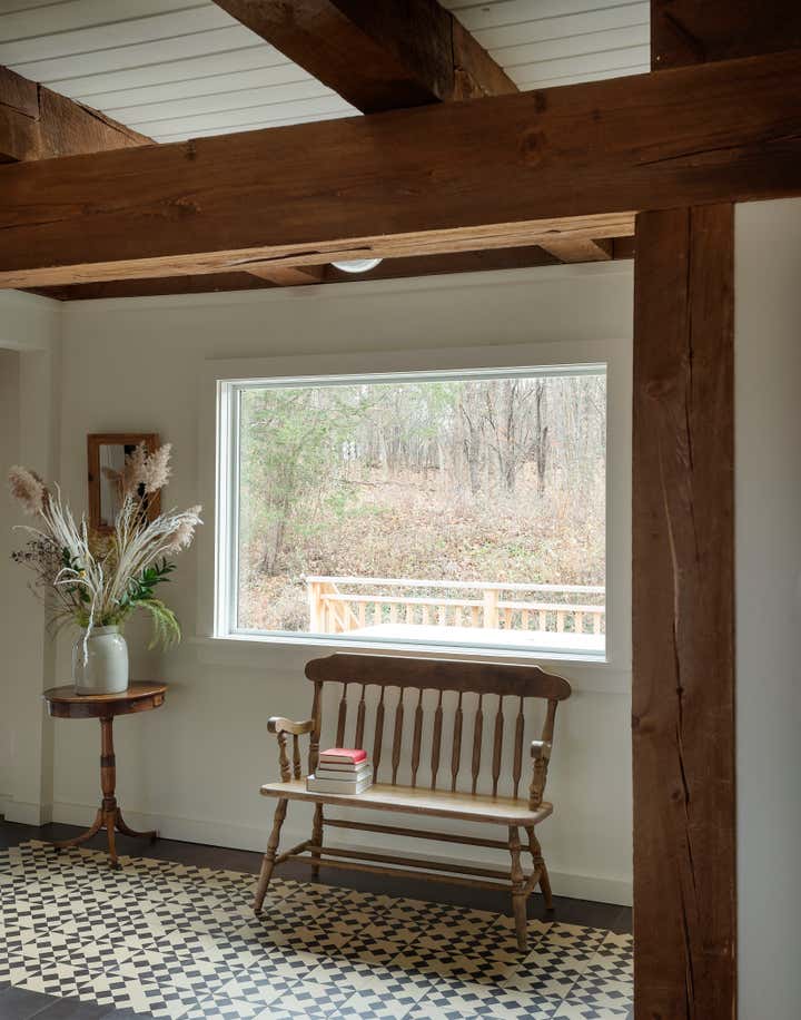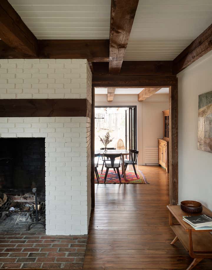 The river town of Hudson has become an escape for New York creatives looking for a little more space and a slower pace of life. The homeowners, who split their time between New York, Los Angeles, and London, came to us to brighten up and modernize their new country home located just outside the town. The original floor plan was broken up, leading to a dark interior and a disorienting circulation. In order to address these issues, we removed non-essential interior walls, added windows, and opened up an exterior wall with folding glass doors. The result is a more open and communal living space. The natural and neutral finishes throughout emphasize the heavy timber construction, which we took great care to not disrupt with the new plumbing on the second floor. In the home office, primary suite and guest room, color and vintage furnishings create spaces that break the neutral palette and mood. The guest room’s floral wallpaper for example, was salvaged to keep a little of the home’s history and the clients leaned into the patterns with their decoration and styling. The result of the renovation is a home that has been modernized to meet the needs of the family who live there, without losing the character that attracted them to the property. We are excited to see the house grow as the young family continues to add to it’s history.
