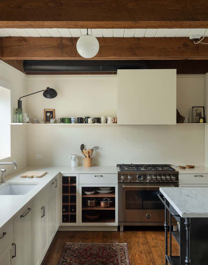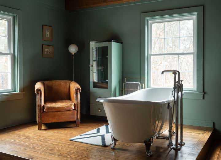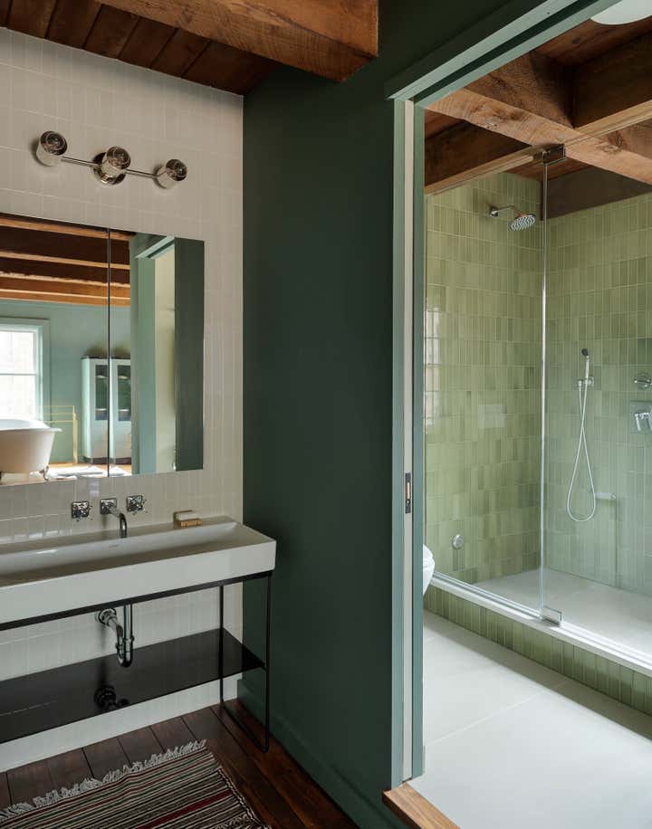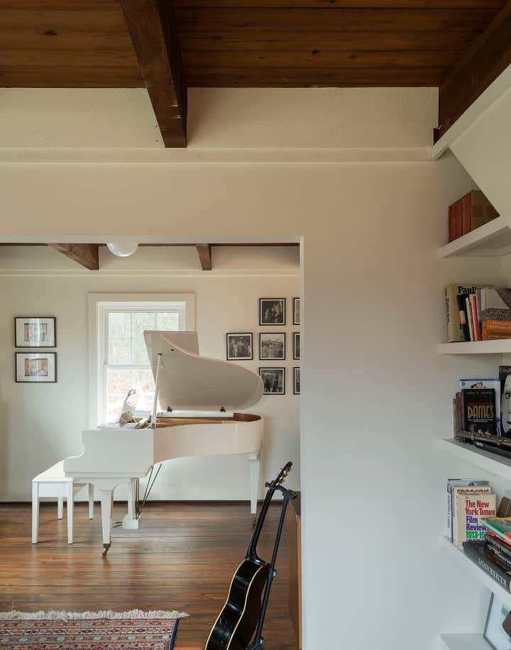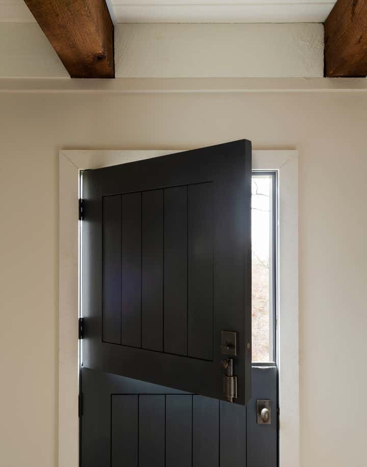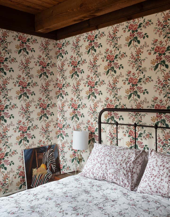 The river town of Hudson has become an escape for New York creatives looking for a little more space and a slower pace of life. The homeowners, who split their time between New York, Los Angeles, and London, came to us to brighten up and modernize their new country home located just outside the town. The original floor plan was broken up, leading to a dark interior and a disorienting circulation. In order to address these issues, we removed non-essential interior walls, added windows, and opened up an exterior wall with folding glass doors. The result is a more open and communal living space. The natural and neutral finishes throughout emphasize the heavy timber construction, which we took great care to not disrupt with the new plumbing on the second floor. In the home office, primary suite and guest room, color and vintage furnishings create spaces that break the neutral palette and mood. The guest room’s floral wallpaper for example, was salvaged to keep a little of the home’s history and the clients leaned into the patterns with their decoration and styling. The result of the renovation is a home that has been modernized to meet the needs of the family who live there, without losing the character that attracted them to the property. We are excited to see the house grow as the young family continues to add to it’s history.