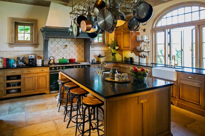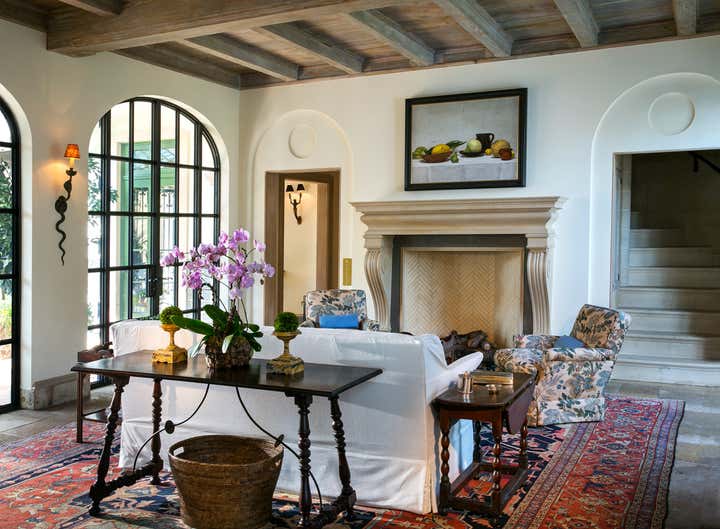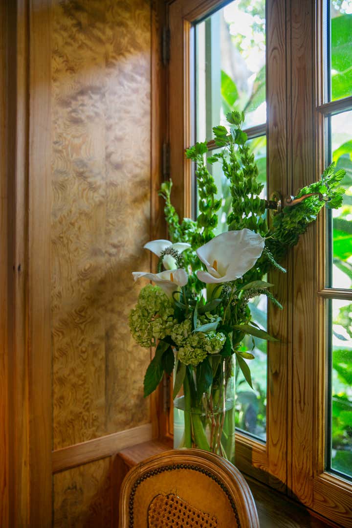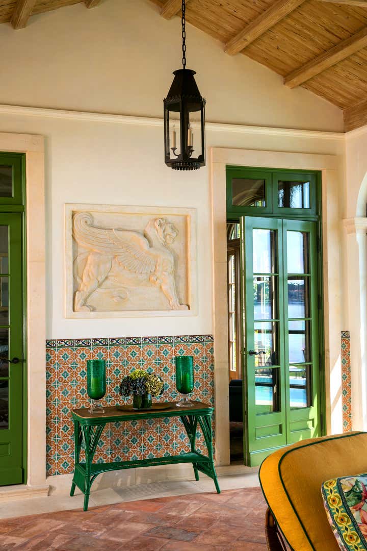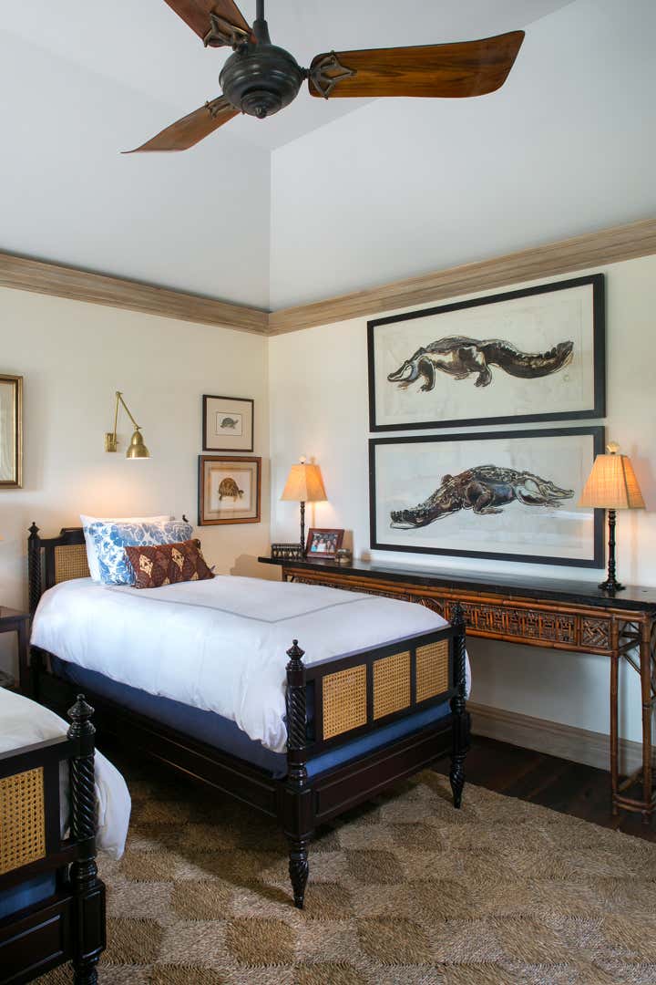 Inside, the floors are limestone and terra cotta from Burgundy. Each bathroom has reclaimed tile from Belgium. Cypress paneling, ceilings, baseboards, and casings throughout speak to the Florida vernacular. The fans are from Italy. The shutters actually work and are closed at night to allow breezes in but bugs out.