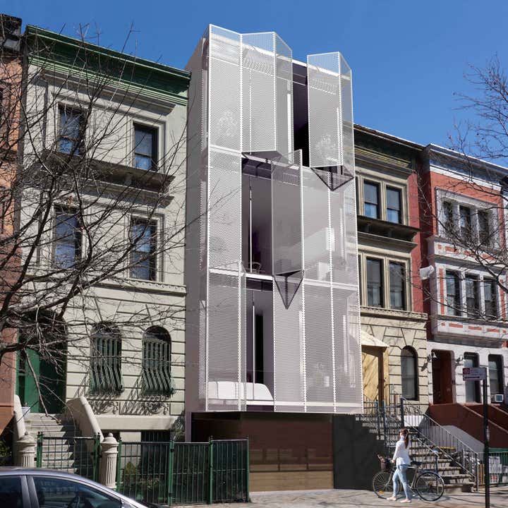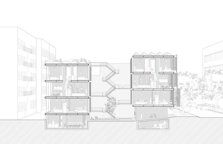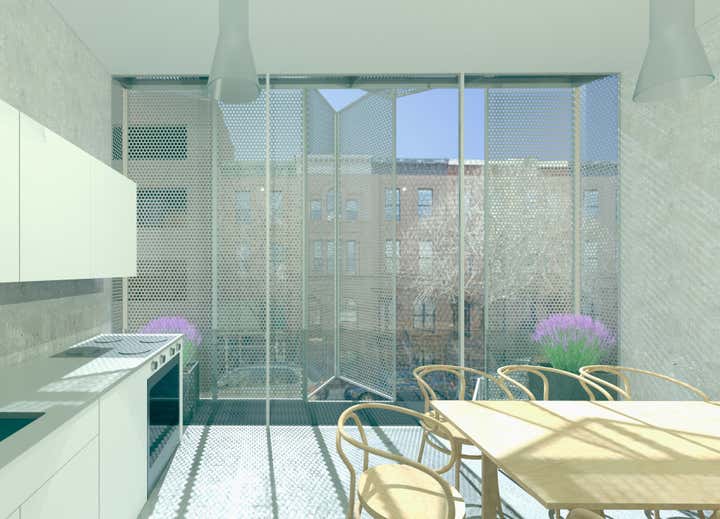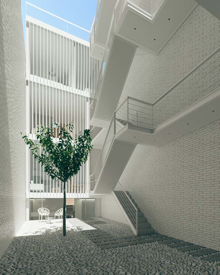 The traditional development of properties in the area of study is based on “brownstone” buildings lined out throughout streets filled with trees. They usually present a four story design with a sandstone façade and stoops on one of its sides that would allow access to the parlor level and the interior is divided lengthwise into two parts, with about a third of it taken up by a staircase on one side and the remaining occupied by the living area. Converted into multifamily apartment buildings, this layout tends to be too long and waste a lot of circulation space. Additionally, the backyard is usually accessible by one dweller only. Our proposal challenges the traditional approach to structuring small lots with a long and narrow configuration. We suggest revisiting the zoning to reconsider the rear setback of the property line. That will allow us to create a central void, a courtyard of sorts, at the heart of the building, splitting the building in two volumes. This open space will bring light, ventilation, allow vertical circulation and supply a safe and controlled recreational space for all dwellers. Our proposal gives an alternative answer to in-fill projects in the consolidated urban fabric, creating a new typology structured in three equal modules of 32’. The central module is emptied, allowing for a light staircase to become a celebration of this private communal space and generating staggered floorplates that increase privacy for each dweller. Every units will maximize usable space by reducing circulation. The double façade of each apartment will maximize light and crossed ventilation while the dynamic square serves as the organizing element of the building, providing an open space for residents and centralizing the circulation.