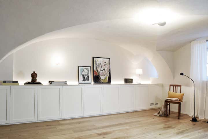 Basement living doesn t have to mean living in dark, uncomfortable basements and can have more potential than some people think. The goal of this project was to create guest spaces that inspire on a daily basis and warmly welcome both residents and guests. The concept focused on the expressive architecture in the form of a historic vaulted cellar. historic vaulted cellar, which is located in the former St. Joseph monastery and has a history dating back to the 18th century. Since the rooms are used as as workrooms, studios and guest rooms and also washing machines and dryers had to find their place, we developed a storage furniture which runs through all three rooms. through all three rooms. In order to orientate on the language of the historical walls and the historical built-in cupboard without appearing imposed, the fronts were manufactured in a frame construction and were handleless. The top panel made of quartz composite stone in a marble look gives the furniture its elegance and creates a pleasant contrast to the otherwise rather matte surfaces. A highlight is the old built-in cupboard, which has been preserved and refurbished and is located in the front area of the basement. The indirect lighting integrated into the lighting concept lighting (behind sideboards and in cable channels) emphasizes the vault and, together with the selected wall, ceiling, floor and table lamps, creates a flexible use of the rooms.