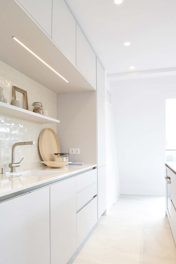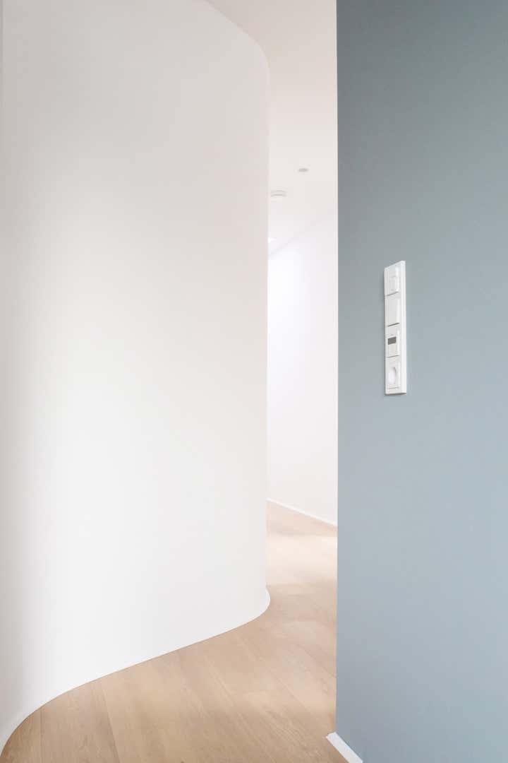 The roof studio (new building) was accompanied by us from the conception to the detailed planning and implementation. The clients wanted a timeless elegant, bright and cozy apartment. High-quality materials, calm colors, certain accents and the combination of old and new should be reflected in the apartment. In order to avoid tight-looking corners, gentle curves were integrated into both the architecture and the furniture (hallway/kitchen). Light and rooms can thus flow harmoniously into each other. In the selection of materials, great importance was natural materials in their clear, as well as handcrafted natural appearance. The solitary kitchen block with its gentle curve leads into the living area and connects it with the dining area. with the dining area. The panoramic fireplace creates a spatial separation without depriving the area of its openness. The "La Terre I II" side tables and the "Joujou" floor lamp were designed by Agnes Morguet. The lighting concept was also thought through. Thanks to numerous skylights and a skylight in the hallway, the interior is very bright, so that ceiling recessed and and surface-mounted luminaires were used subtly. Wall, table and floor lamps as well as suspended luminaires for the dining table and bed complete the lighting concept. To emphasize the feeling of lightness all rooms were painted in porcelain white. Only in the bedroom was a darker and more calming ambience deliberately created with a blue-grey paint job.