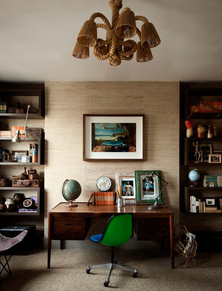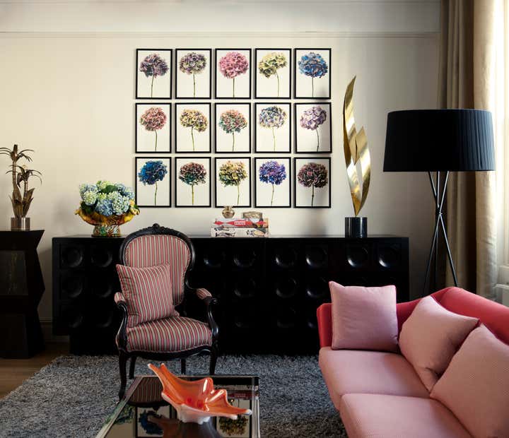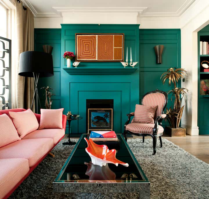 This Georgian home in Islington was acquired by an Anglo/Australian couple who had lived and travelled abroad extensively, and had amassed a unique collection of art and objects. The house was unfortunately stripped of its original interior features, so we tried to evoke a sense of history by using vintage and antique furnishings from various periods and styles. We furnished the house almost entirely with vintage pieces, creating a colourful and eclectic mix which reflected our clients diverse backgrounds and worldly experiences. These clients were not afraid of colour, and a collection of aboriginal paintings, with their earthy red, pink and orange tones, was the basis for the contrasting vibrant teal colour for the Georgian-inspired paneling and cabinetry in the double reception room. The master bathroom had a distinctly vintage aesthetic, where we made use of reclaimed teak laboratory tops to the vanity and the bath.