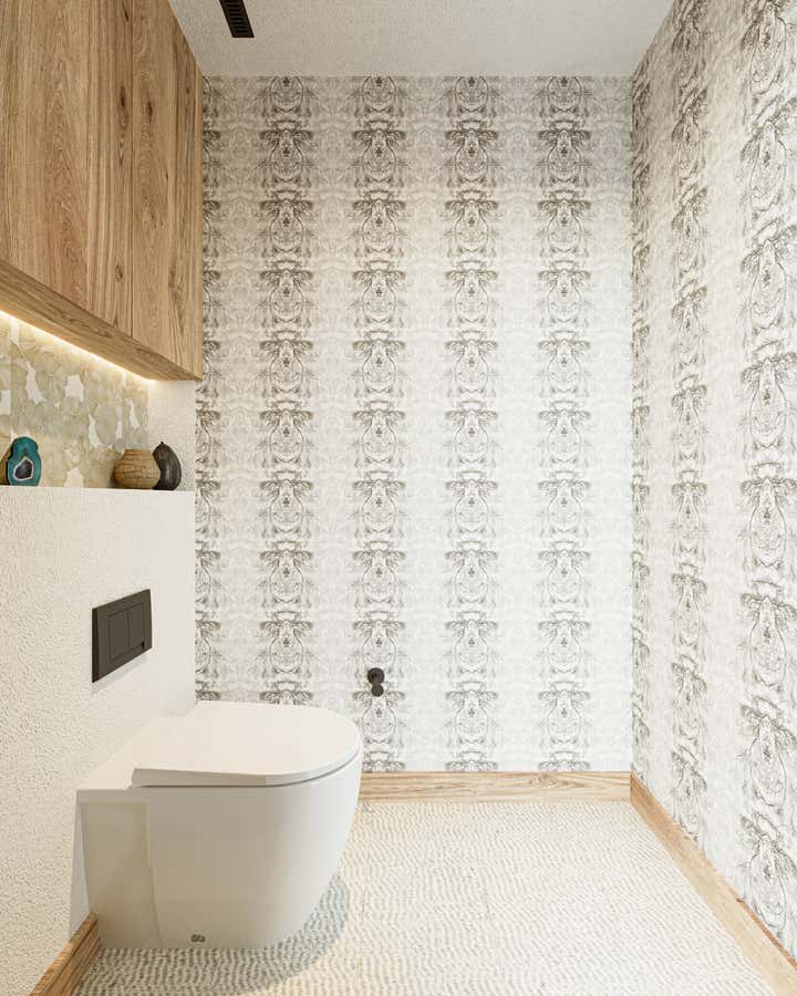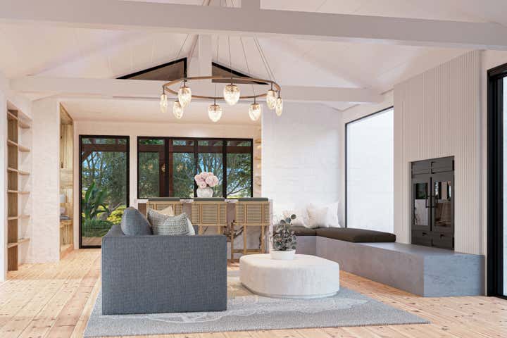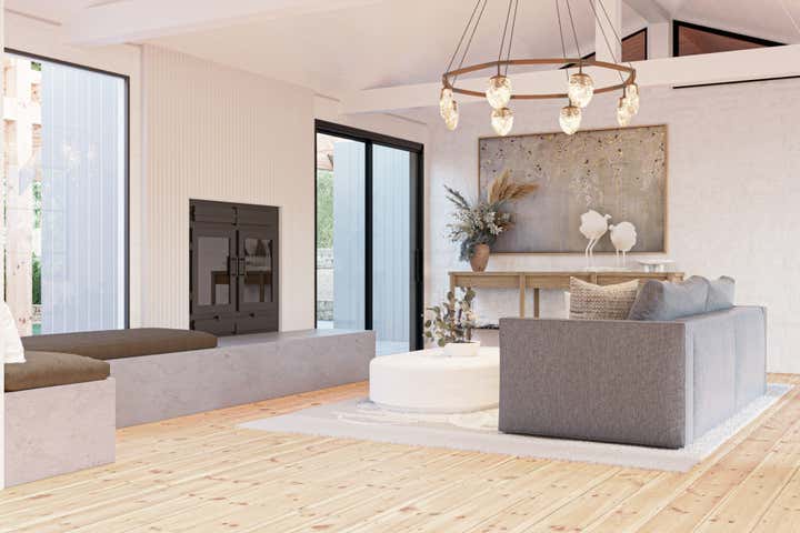 The living room features a fireplace clad in matte white textured porcelain tile. The Oak and faux leather sideboard, and chandelier made from natural wood and bronze create warmth. The light grey rug made from vegan bamboo silk incorporates an image of mangrove trees.