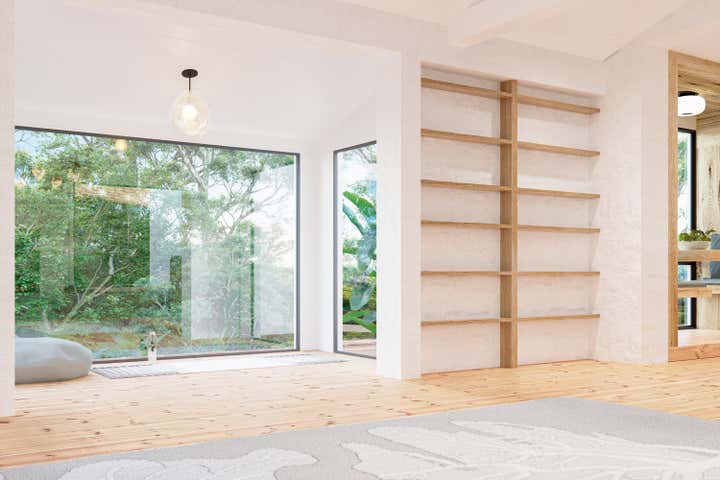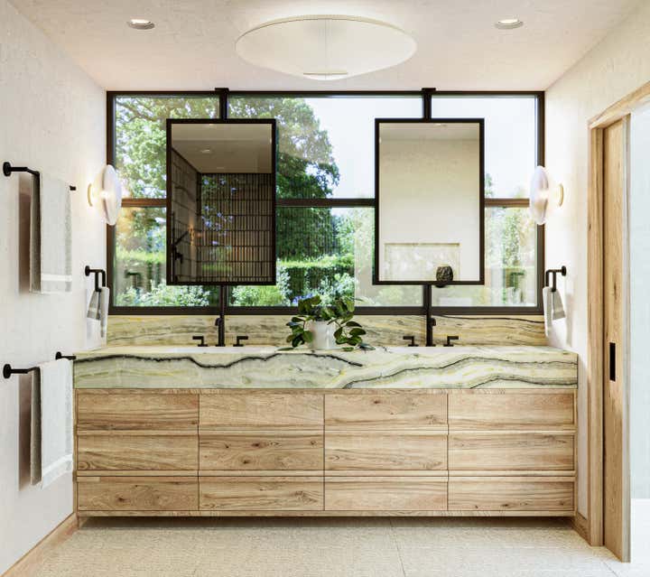Japandi design often includes subtle color palettes, wood cladding, and large windows that incorporate biophilic elements within the home. These design elements perfectly align with this Californian home project, surrounded by peaceful, serene woodlands.