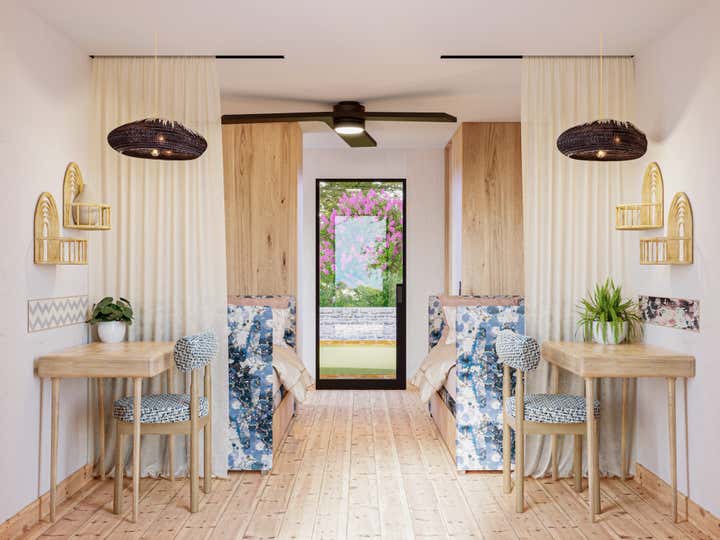 The children s room includes custom bed-frames upholstered in a cotton linen blend. There are two built-in closets in the back of the room, made from Ash, solid oak and walnut desks and natural oak chairs at the front of the room.