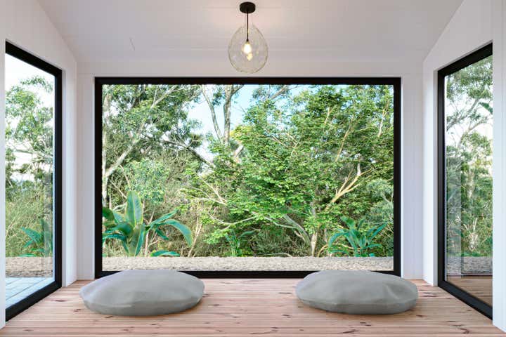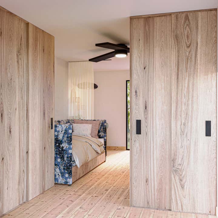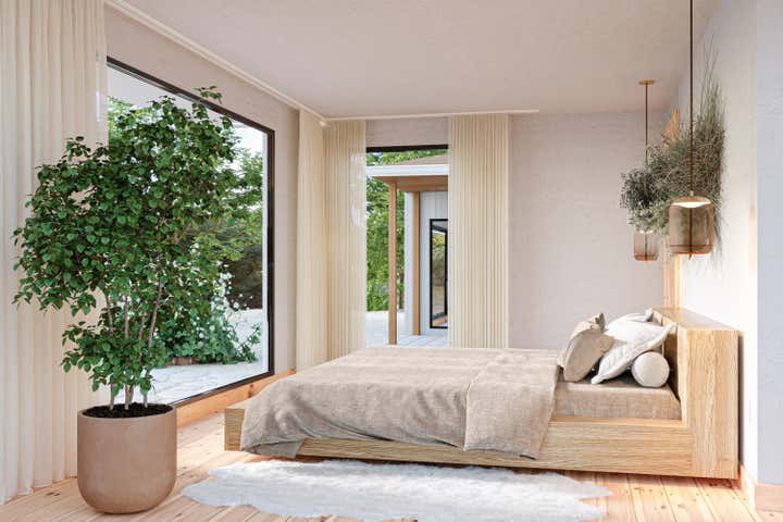 The main bedroom features an extended bed frame, crafted from sustainably harvested solid oak. Floor-to-ceiling sheer white linen drapery offers light filtration and the feeling of privacy while preserving the beautiful view of the woodlands outside.