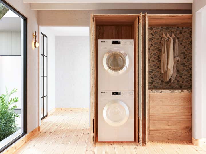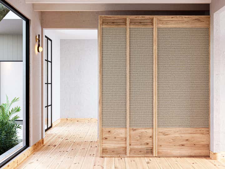 A mudroom with a laundry cabinet features custom screens, made from Ash and natural rattan cane webbing.
