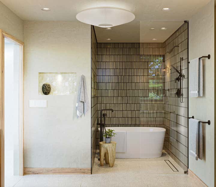 Subtle green mosaic tiles encase the shower to create a gentle contrast with the lighter tone of the textured marble floor.