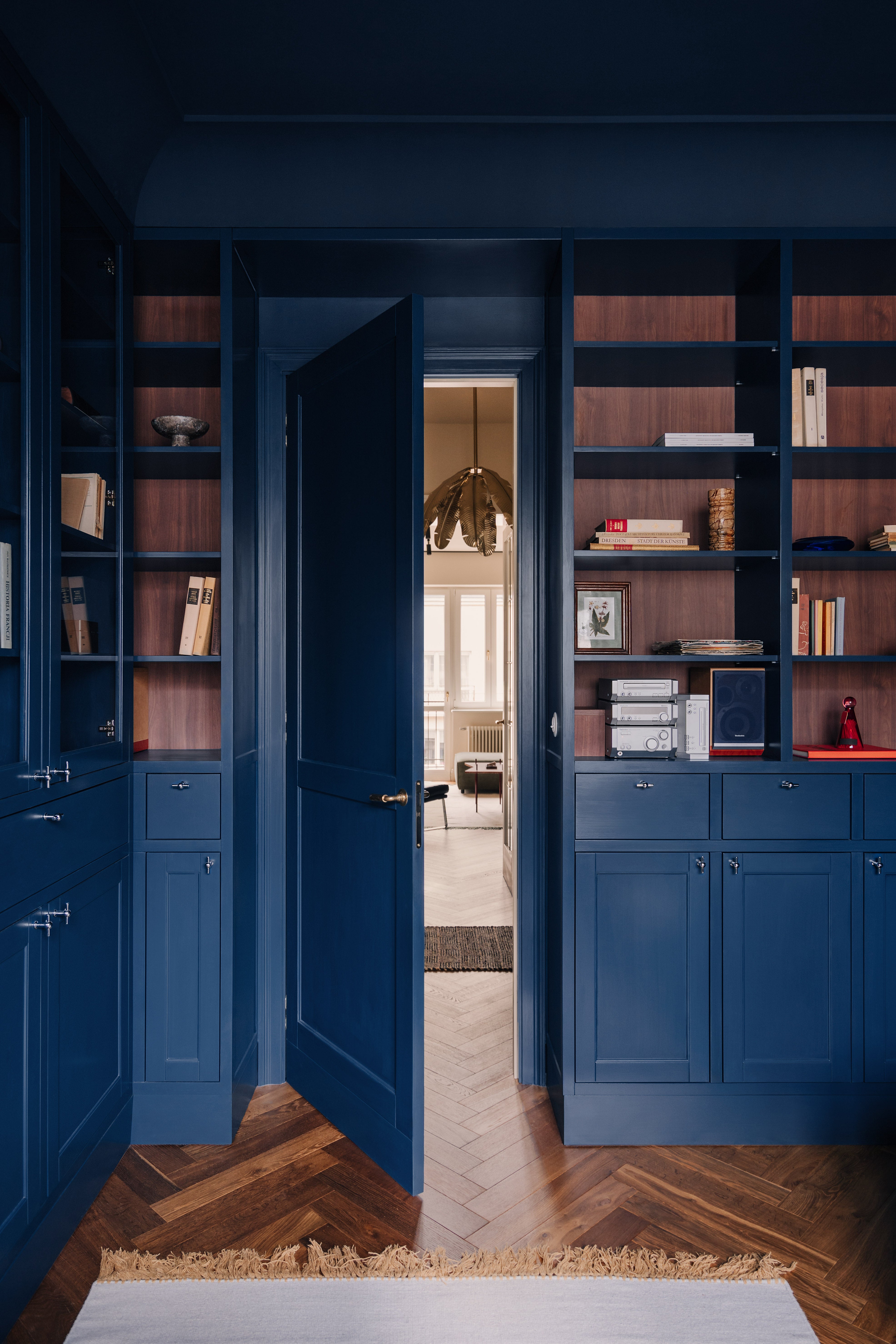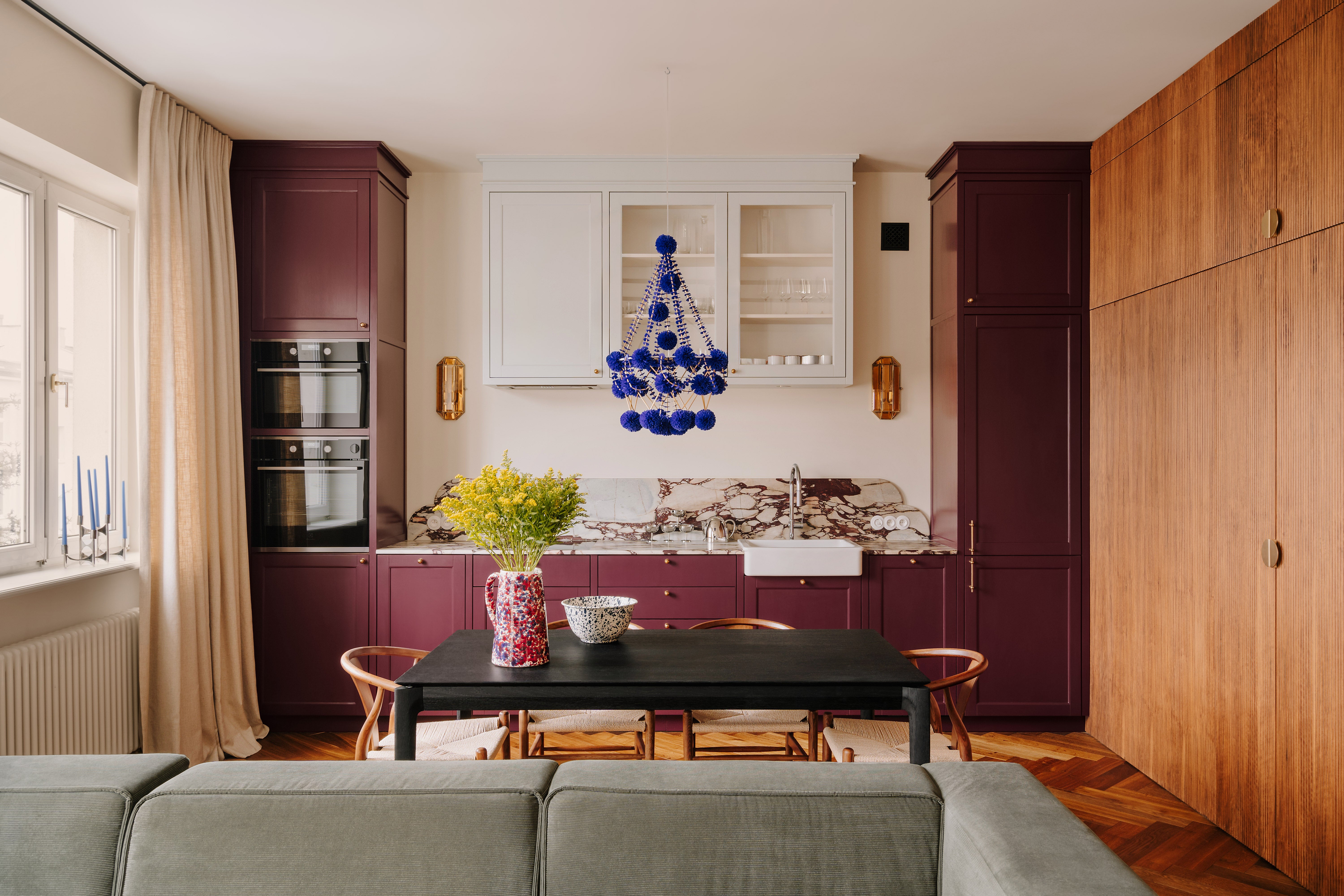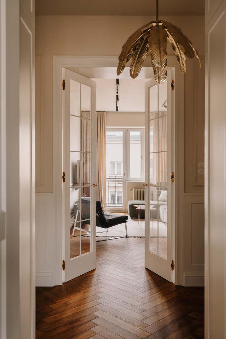 This apartment, nestled in a pre-war tenement in Old Mokotów, has undergone a vibrant transformation. The inspiration stemmed from the historic color palettes of pre-war interiors and the timeless design elements of that era. The client envisioned a timeless, eclectic interior that seamlessly blends classic and contemporary elements. The project involved merging two rooms to create a spacious living area, designing an atmospheric office, a serene bedroom, and expanding the bathroom.