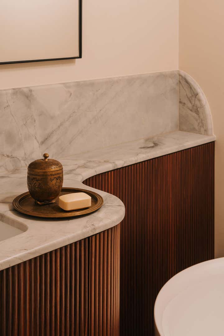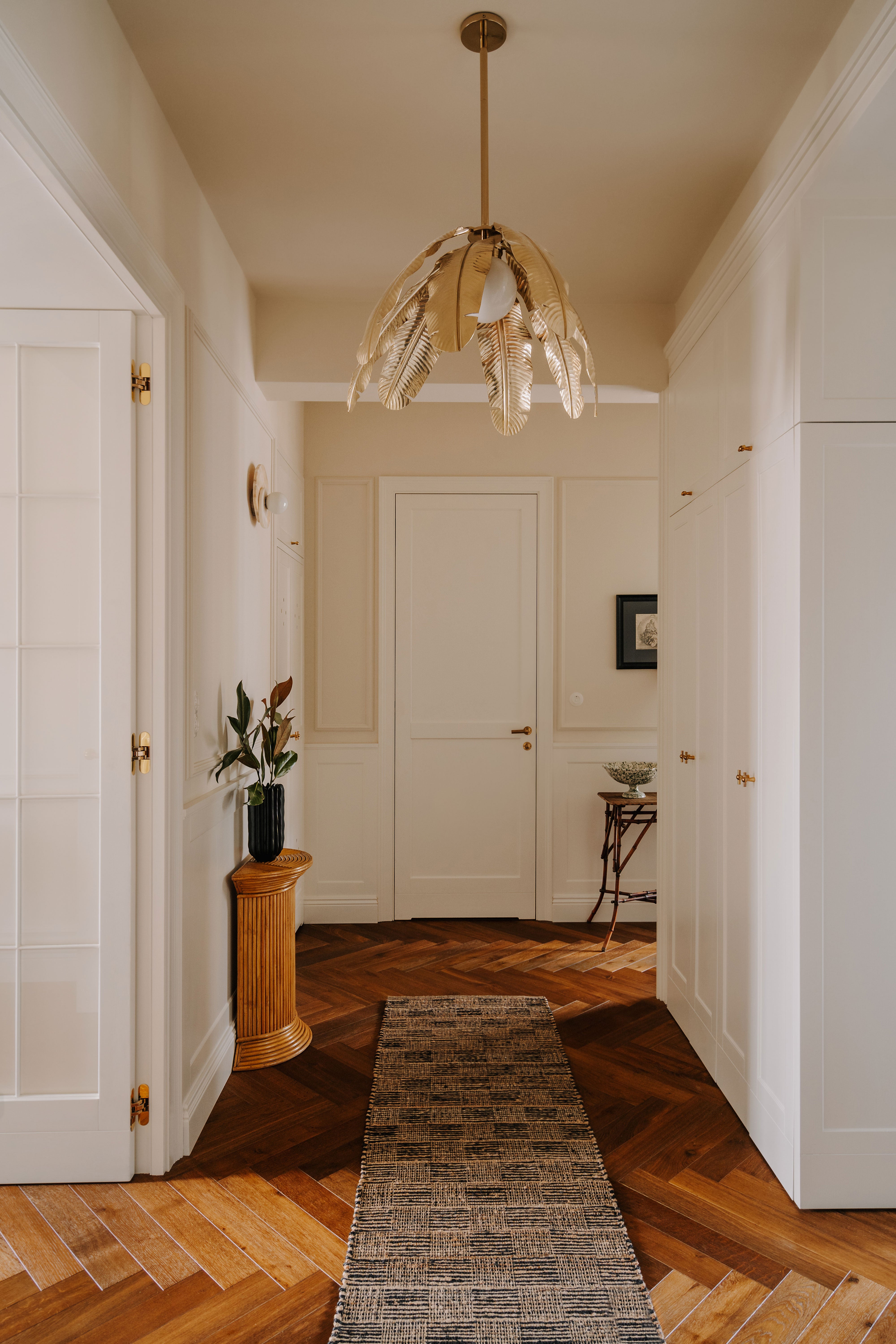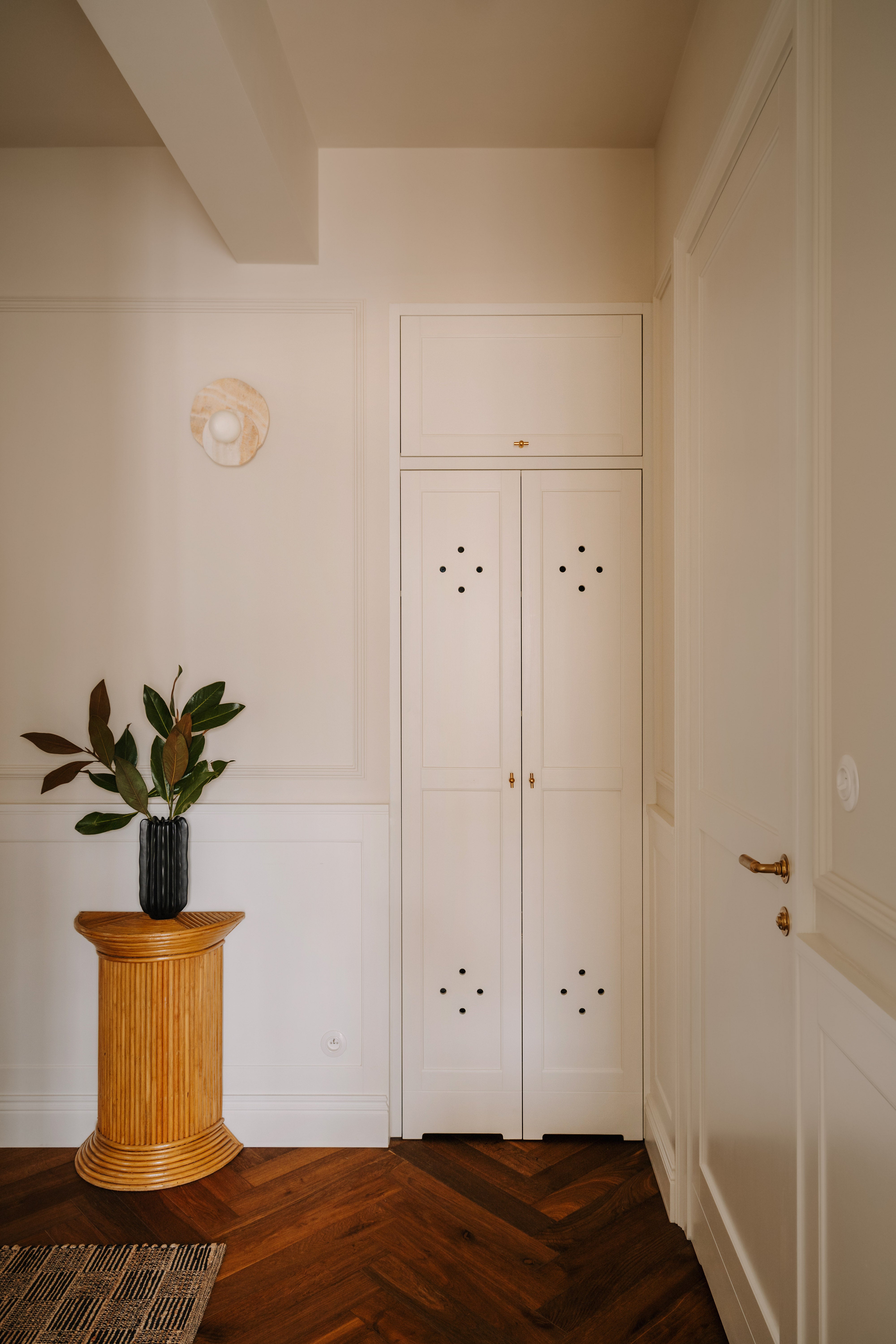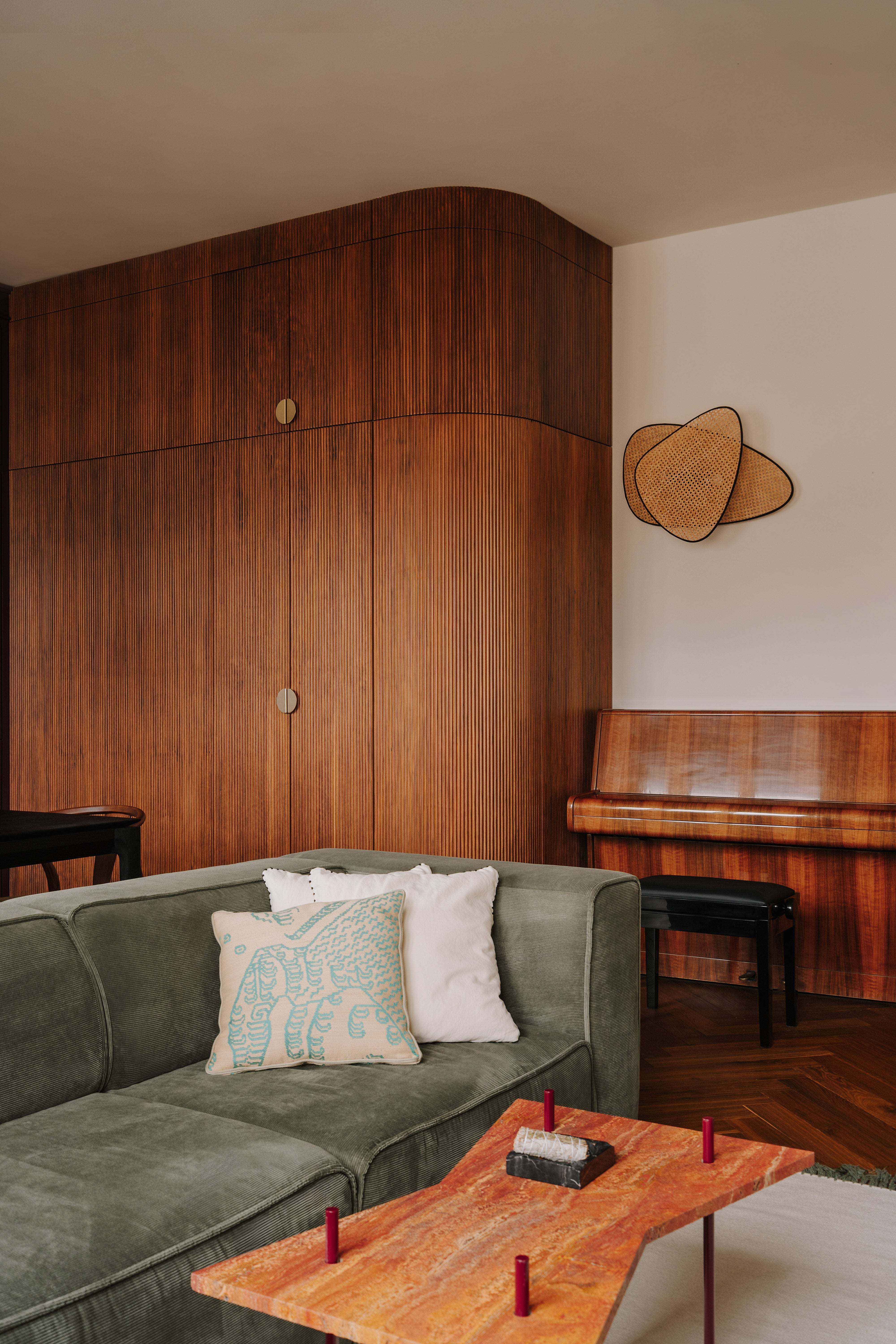 This apartment, nestled in a pre-war tenement in Old Mokotów, has undergone a vibrant transformation. The inspiration stemmed from the historic color palettes of pre-war interiors and the timeless design elements of that era. The client envisioned a timeless, eclectic interior that seamlessly blends classic and contemporary elements. The project involved merging two rooms to create a spacious living area, designing an atmospheric office, a serene bedroom, and expanding the bathroom.
