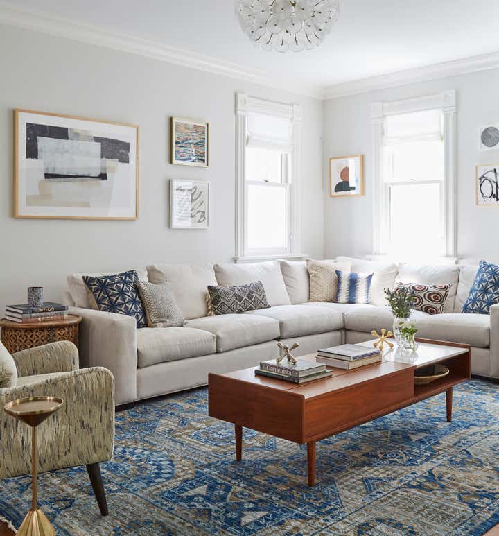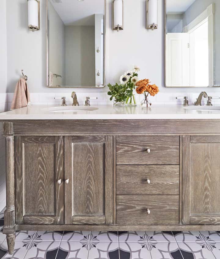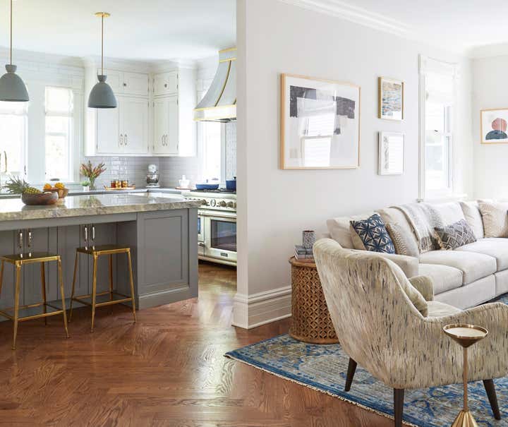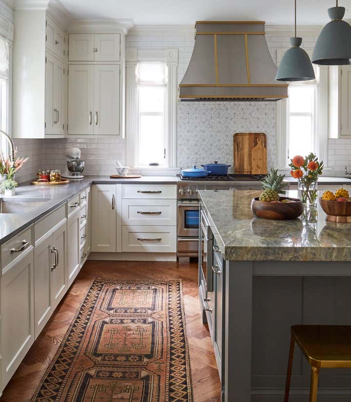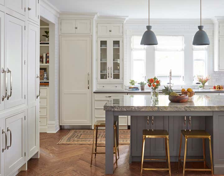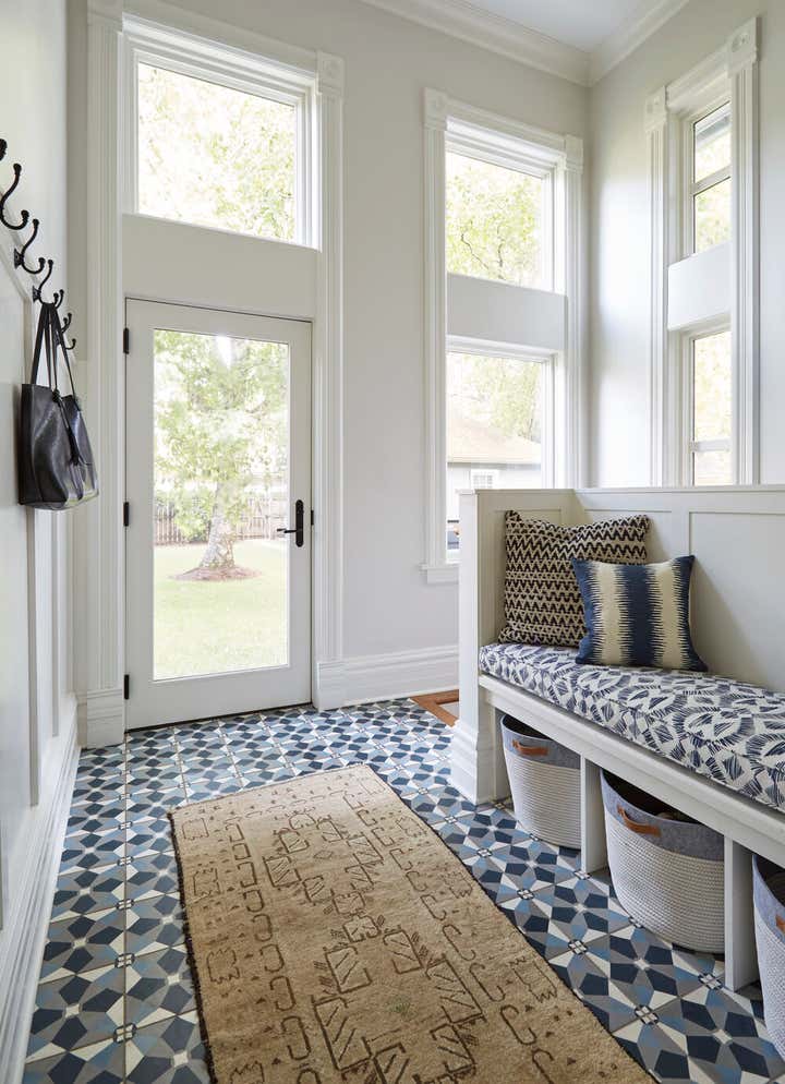The scope of this project involved a new addition to a classic Victorian home in Chicago’s Oak Park neighborhood. KitchenLab Interiors’ design was inspired by a calm, classic gray and blue palette with a family friendly vibe. While the clients had a large laundry list, the budget had to go pretty far to accomplish everything they wanted. As often accompanies an addition project, the whole house was also gutted and remodeled, and the KLI team specified all new furniture while incorporating a few of the clients’ existing pieces like the dining room table. The scope included the kitchen, butler’s pantry, message center, mudroom and 4 full bathrooms, laundry, along with a master bath and master bedroom upstairs, and interior design. The coolness of the blue and gray palette is tempered by a warm wood floor and warm wall color. The mudroom concrete floor tiles are in hues of blues and grays. We really had the opportunity to use a lot of great tile and some terrific rugs on this project. Custom cabinetry, finishes and fixtures provided by KLI.