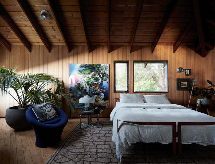 One of three dwellings on the 10 acre property, this is more than the typical beach shack, with an abundance of cedar, mixed with various and pronounced angles throughout each section of the house, as seen in the layout, windows, walls and bespoke interior details.