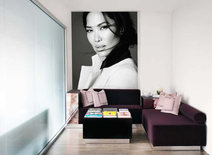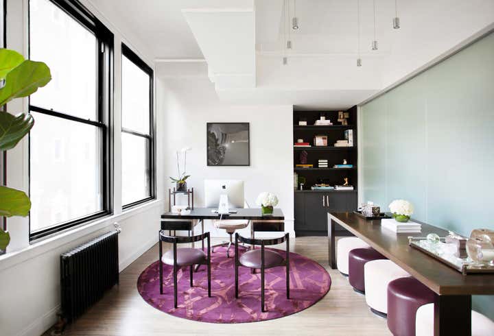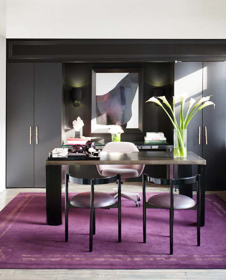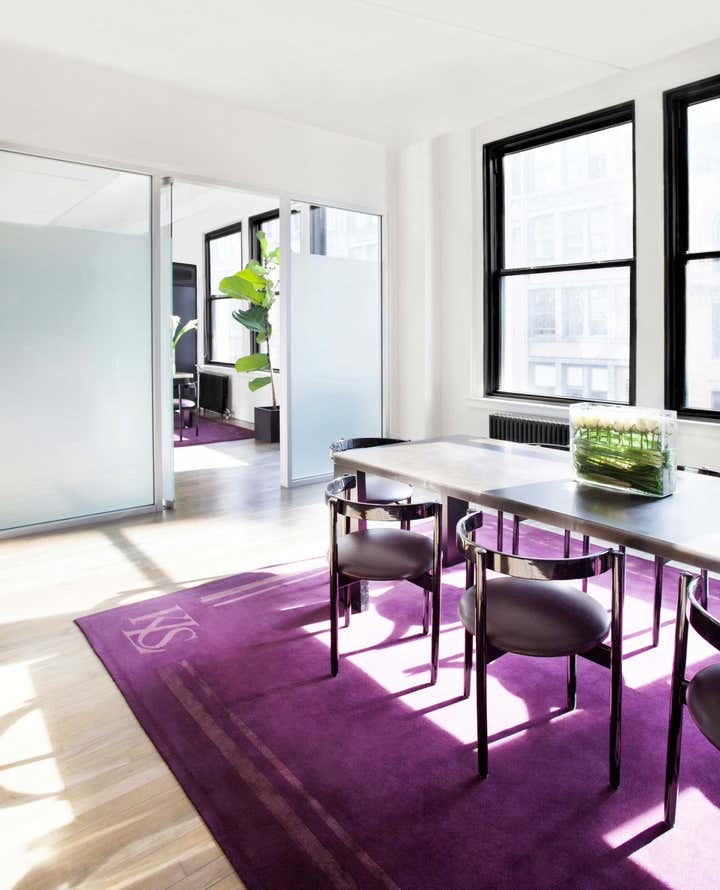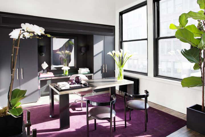 Nicole Fuller Interiors was enlisted to design and rebrand the new offices for Kimora Lee Simmons International. The client requested a full departure from her previous brand image, opting for a refined and sophisticated office space with logo and color scheme to match. Fuller presented a palette of black, white, and aubergine with hints of nude pink to encapsulate the brand’s metropolitan femininity. In addition to designs from Nicole Fuller’s signature furniture collection, Isabella Wolfe, bespoke furnishings and finishes are found throughout the office, from a custom rug designed in Nepal to a special art piece commissioned by photographer Steven Klein.