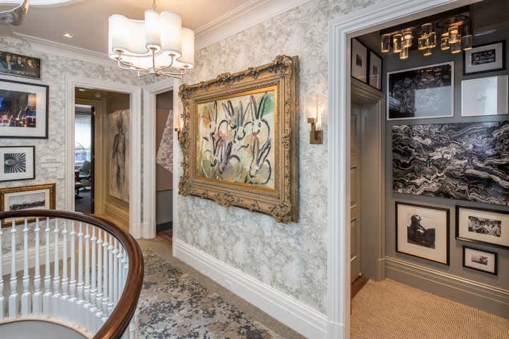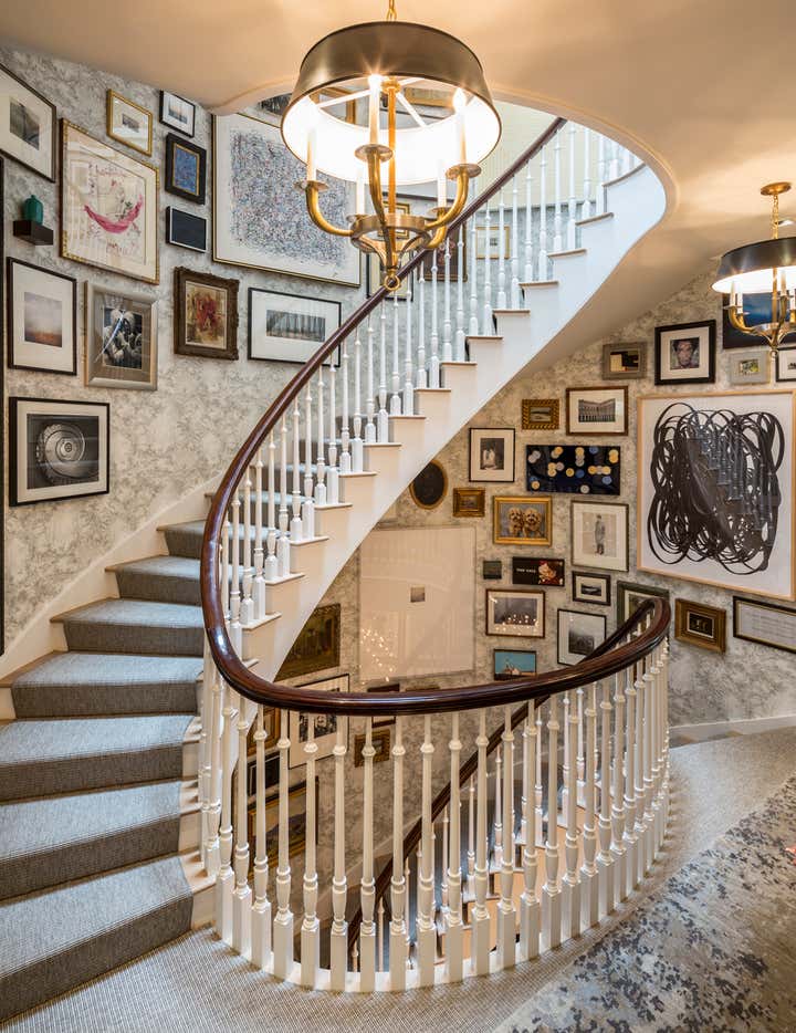 Inspired by the grand scale classic architectural details found in the stair hall of the Arthur Sach Mansion, first time Kips Bay designer Philip Mitchell has chosen to approach the space in a very personal manner. As an homage to his elegant refined mother, philip has combined her traditional decorating influence with his contemporary approach to design. Contrasting his initial inspiration taken from the traditional pattern fresh colour palette of Mulberry s Torridon wall covering, with a carefully curated art collection of both contemporary traditional pieces of various mediums, Philip has created a modern day take on a traditional salon style installation. The Eclectic combination of new antique lighting, the subtle mix of textured runners, the juxtaposition of dramatic art the sparsely placed bespoke furnishings creates a unique visual experience as you travel up the stairs to the surprise bar alcove.