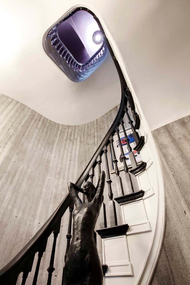 Architecture explores structure, form, space and light engaging all senses and creating emotions. Upon entering our space, you are presented with the second floor Staircase, where we invite you to walk among Kings - without losing the modern touch- by juxtaposing the classical banister, native to the Upper East Side Townhouse, with wrapping concrete wallpaper. Anchored by a bronze nude statue of an empowered woman basking in the glow of our Zimmerman vine chandelier. Ascending to the third floor landing, you are invited into our Chevron Gallery by the redesigned bespoke wood flooring with brass accents, designed to open up the space and guide you through. We were inspired by an existing skylight and James Turrell s artwork to create our own version on the ceiling reminiscent of Art Deco