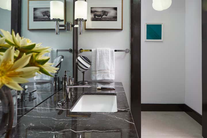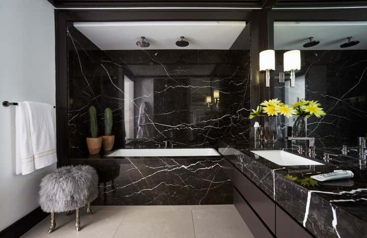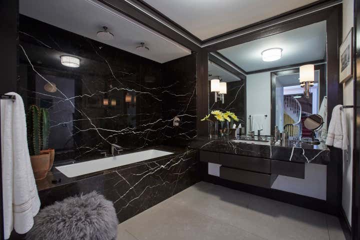 feathering through a trompe l eoil effect that illuminates and expands our ceiling. The third floor Bathroom is unmistakably His, employing a dark marble with dominant white veining that balances the white wall’s with a custom Art Deco vanity we had built and Jean Perzel deco sconces. Using a consistent trim we designed, borrowed from the Chevron Gallery, we frame discreet and bold spaces for the vanity and bathtub. Inviting indeed - when the moment strikes, our bathtub features double shower heads for those more serendipitous moments with an automatic drop down curtain in a concealed trough.