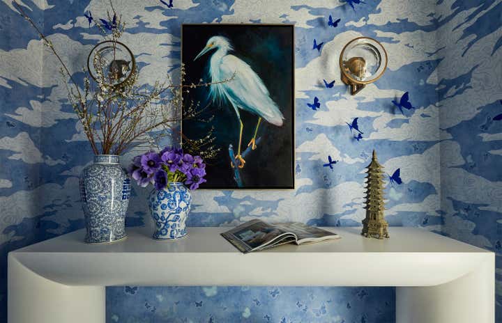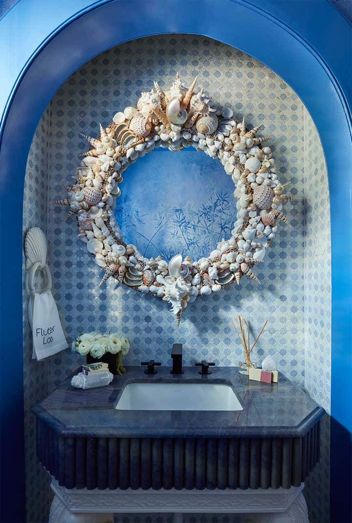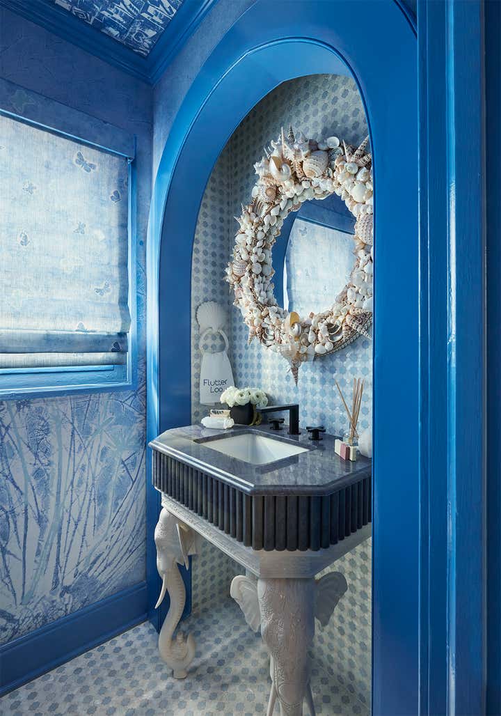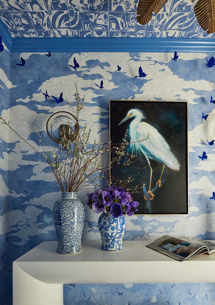 The space is engulfed in a sea of blues that mimic the coastal landscape, while the walls and ceiling are adorned in wallpaper from Andrea’s own product line, Liesl, offering a sense of whimsy. Schumacher isn’t afraid to mix patterns, textures, and materials, as evidenced by the various items used throughout the space.