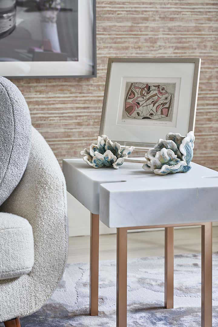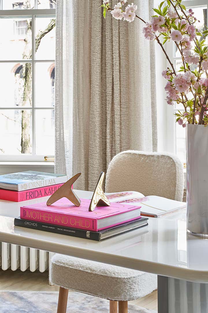 Interiors need to reflect the people who inhabit them. We called our space in the 2019 Kips Bay Designer Show House ‘A Room of One’s Own’ to express our design philosophy. It is a woman’s sanctuary that is soothing, sophisticated and peaceful. The soft color palette of creams and blushes exudes her femininity, while the gentle curves of the furnishings evoke her sensuality. As she is multi-faceted, so too is the room. The space supports her as she juggles the responsibilities of work, family, and home; a desk for productivity, a seating area to entertain friends, and a place by the fire for reflection. Our room is filled with ethereal strength, form and function.